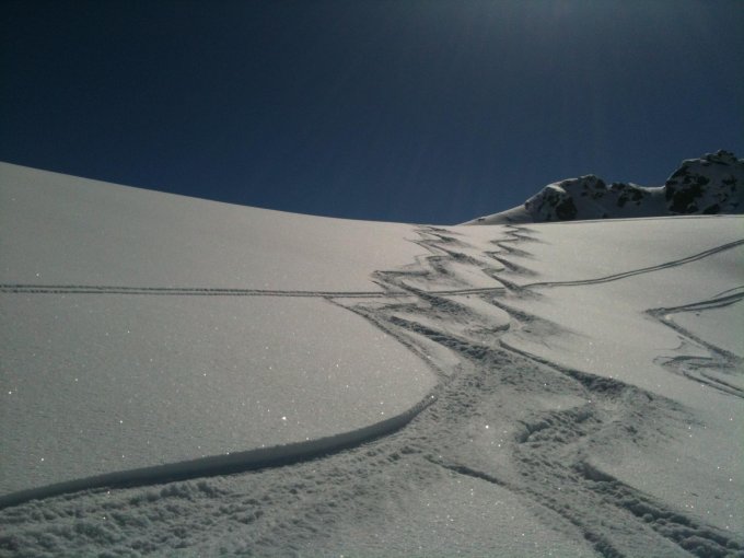 Da die Temperatur am Morgen eher hochwinterlich denn frühlingshaft ist, ist der Schnee noch pulvrig. Oben siebend, unten mit einer etwas tiefen Unterlage die aber gut gefahren werden kann. Verhältnisse werden sich mit der Sonneneinstrahlung ändern.