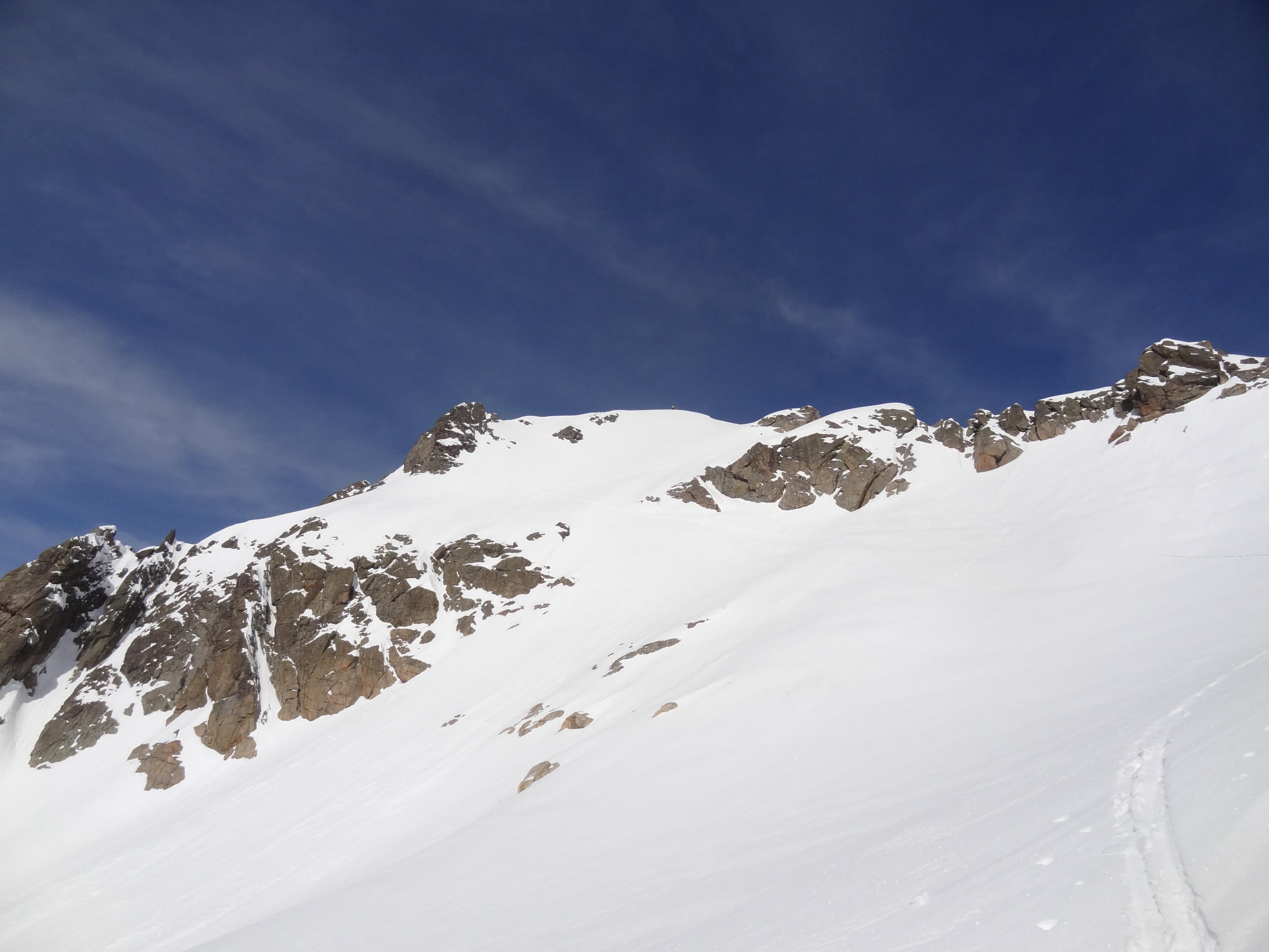 Der Gipfel kann komplett mit Skis erreicht werden, es ist kein Fussaufstieg nötig (für unsicherer Skifahrer eventuell dennoch zu bevorzugen). Der Gipfelhang ist sehr sonnenexponiert. Vor allem wenn die Temperaturen noch wärmer werden muss dies beachtet werden. Heute war eine Abfahrt um ca. 12 Uhr in Ordnung.
