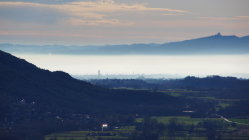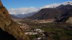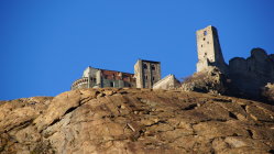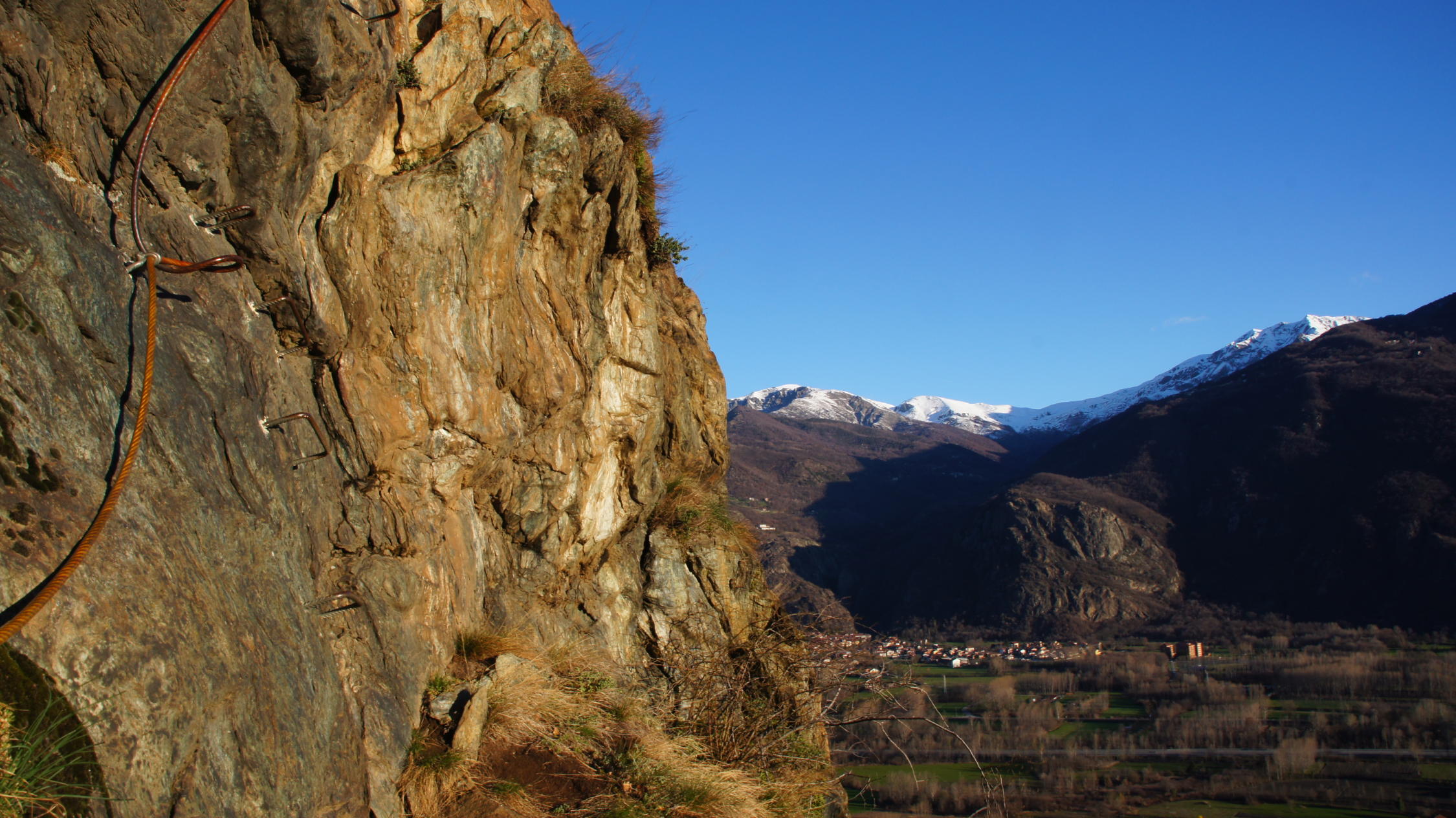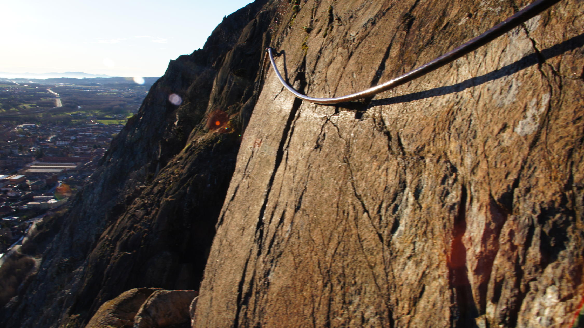 Via ferrata Carlo Giorda Das Seil, das aufgrund seiner gelben Ummantelung stark an einen Gartenschlauch erinnert führt zunächst über plattige Felsen, immer das Sacra di San Michele (eine große Klosteranlage) im Auge mit mittlerer Schwere aufwärts. Nach einem Haken nach rechts und weiterem steilen Aufstieg, teils über Klammern erreicht man das "Pian Cestlet", wo sich nach links die erste Aussteigsmöglichkeit bietet. Der Weiterweg führt zunächst über Gehgelände nach rechts, ehe unter Bäumen der Steig aufwärts zum "U Saut du Cin" (weiterer Notausstieg). Nun führt der Steig nach rechts oben zum Grat, dann wieder nach links, ehe man weiter oben auf eine Dreiseilbrücke trifft (kann umgangen werden). Nach einem weiteren Notausstieg gelangt man an einem Sendemasten ans Ende. Nun weiter Richtung Kloster und rechts haltend einem Weg mit massivem grünem Geländer folgen. Ärgerlich ist nur, dass dieser an einem Privatgrundstück endet. Die Klettersteigler müssen sich unterhalb der Klostermauer zur Strasse vorarbeiten. Das ist nicht nur ekelhaft, sondern an einer Stelle auch nicht ungefährlich, da ein ca. 2,5 hohe Fels ungesichert abgeklettert werden muss. Dann über eine weitere Müllhalde links aufwärts zur Auffahrt zum Kloster.