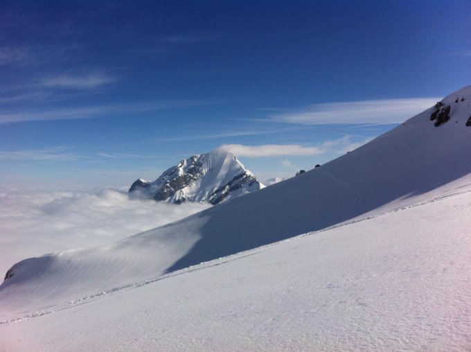 Die Verhältnisse sind sehr gut. Pulver von oben bis unten, einfach genial! Dank dem "Schaufler" von gestern ist die Frühstücktraverse gut begehbar.