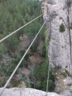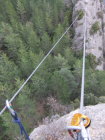 Ich bin die Tyrolienne mit einer 100 g leichten Mini-Einfachrolle (bis 11 mm Drahtseildicke) von Petzl Modell-Nr. 12058 OL 5989 (Made in France) runtergerauscht. Und landete exakt ohne Karacho, sondern aussteige- und absteigegerecht bei letztem Felsbuckel.