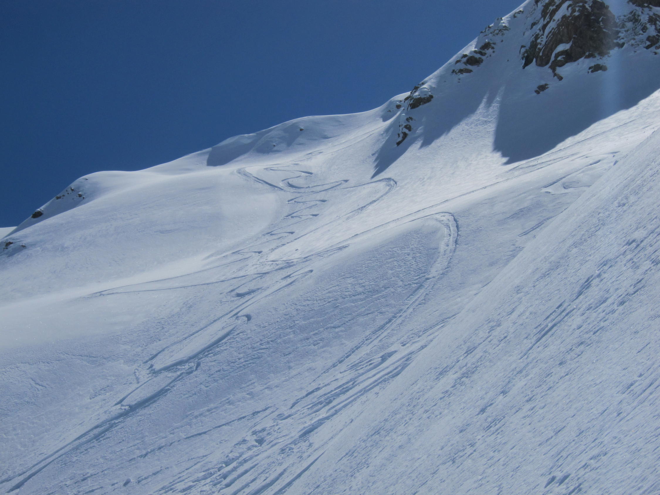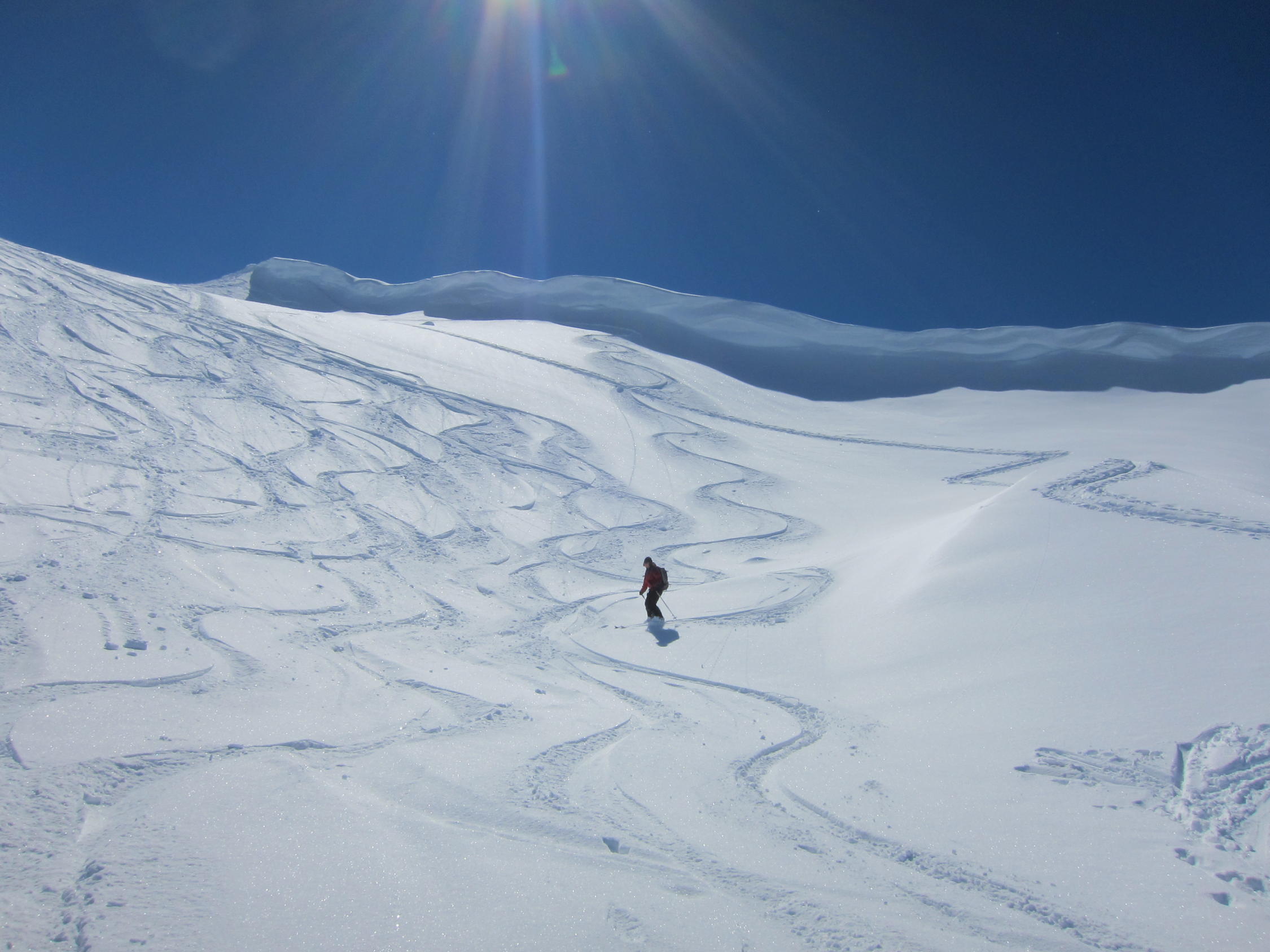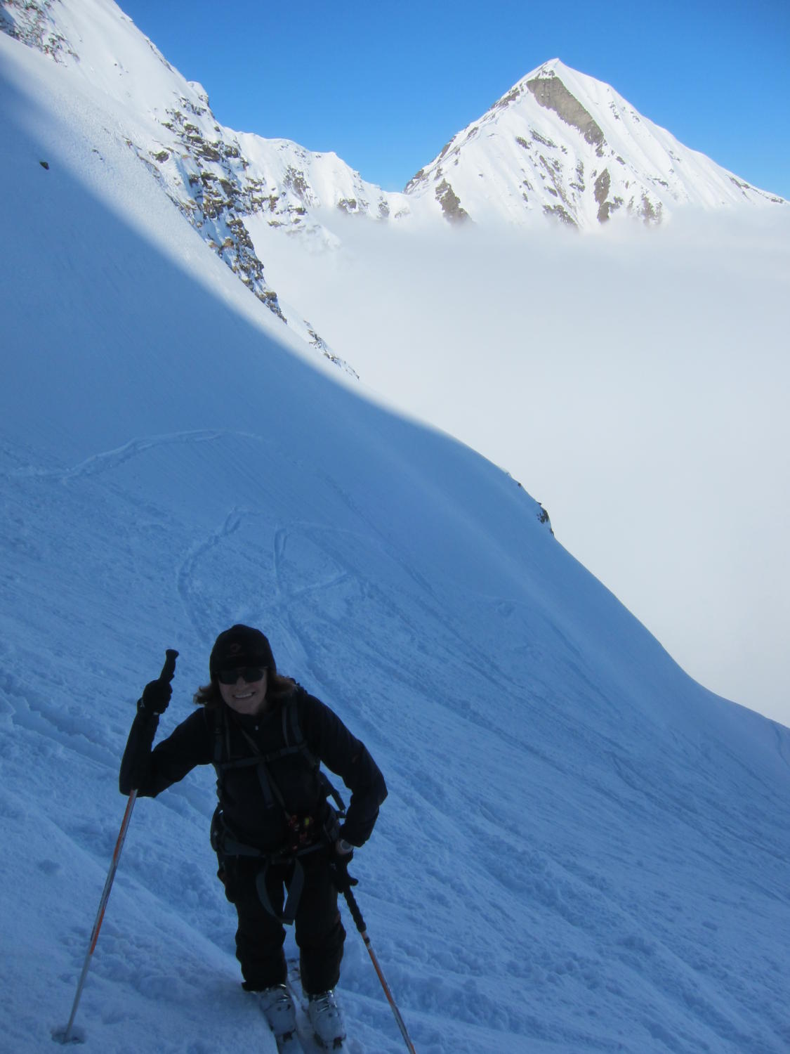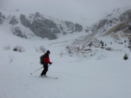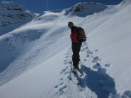 dort knapp tragende Schmelzkruste, darüber in den Nordhängen noch schöner Pulverschnee. Im 1. Couloir rechts Lawinenschnee und verfahrene alte Spuren, daher ein Stück zu Fuss aufgestiegen, ging aber problemlos. Ansonsten