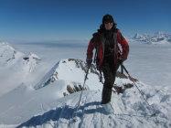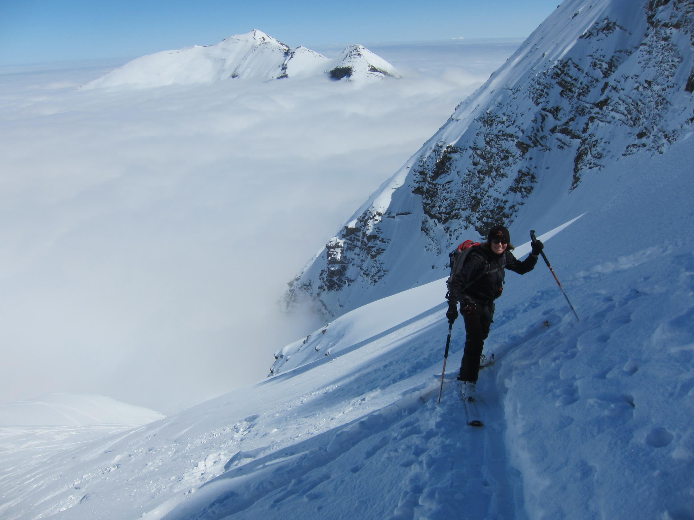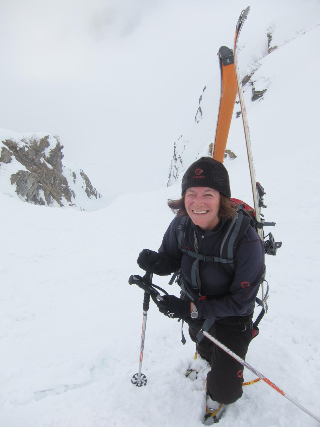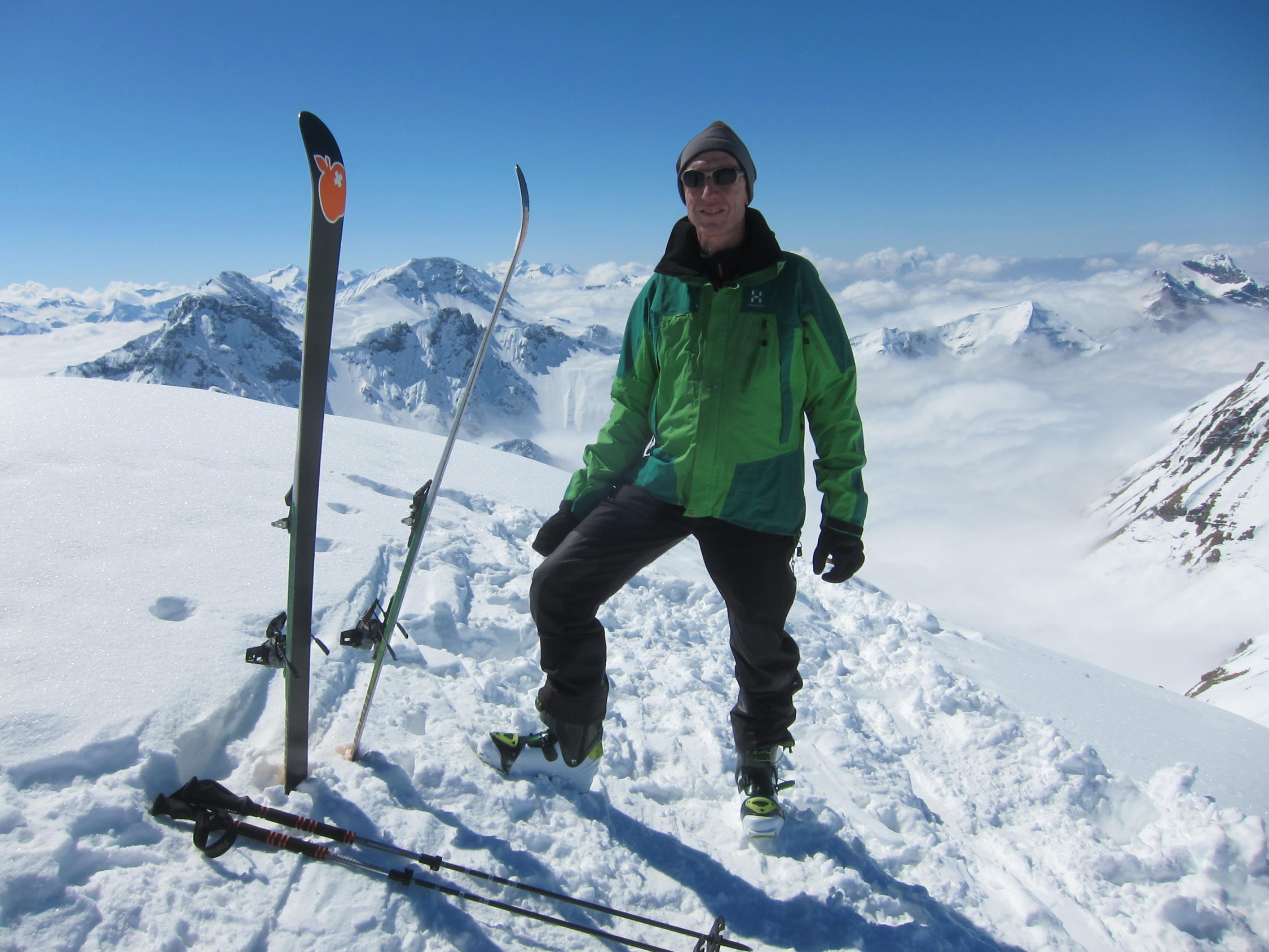 dort knapp tragende Schmelzkruste, darüber in den Nordhängen noch schöner Pulverschnee. Im 1. Couloir rechts Lawinenschnee und verfahrene alte Spuren, daher ein Stück zu Fuss aufgestiegen, ging aber problemlos. Ansonsten