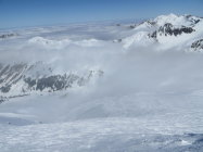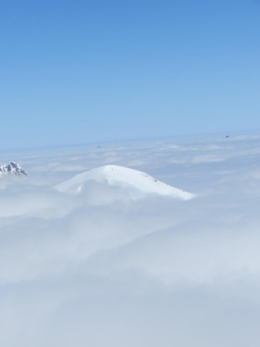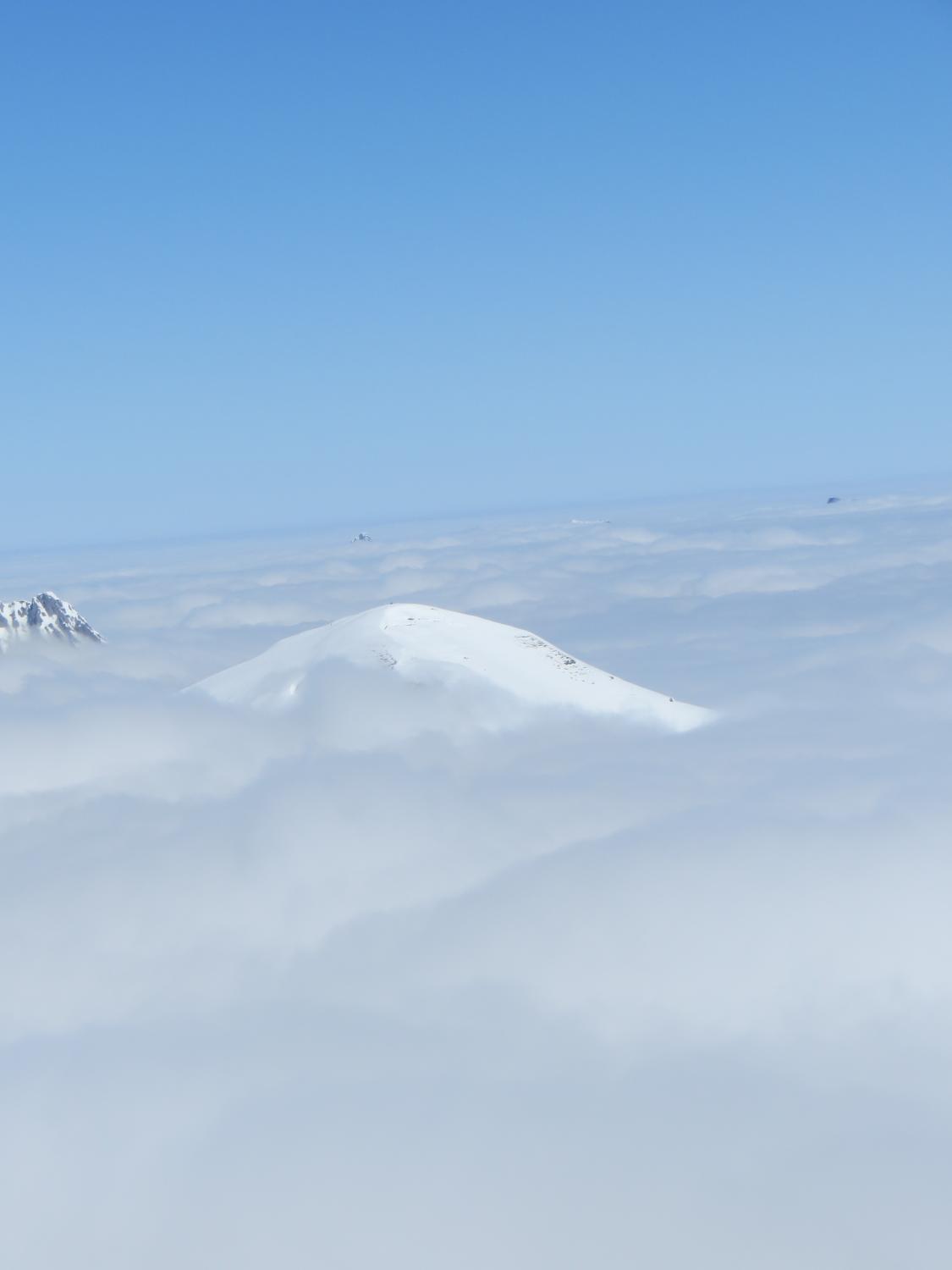 Nebelgrenze bei 2200m, darüber wolkenloser Himmel und fast T-Shirt Temperaturen auf dem Gipfel.