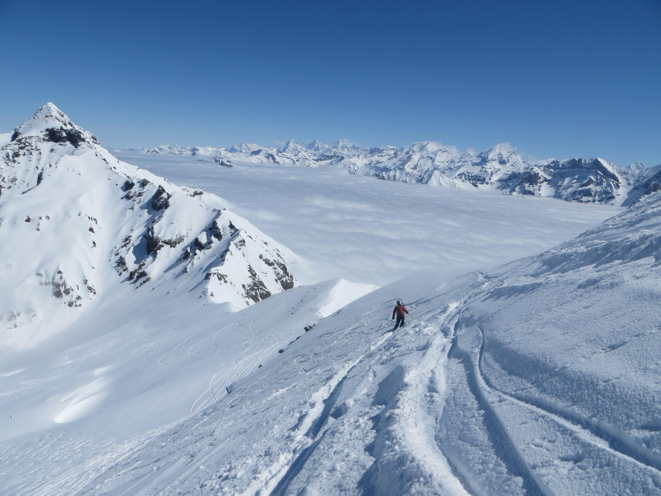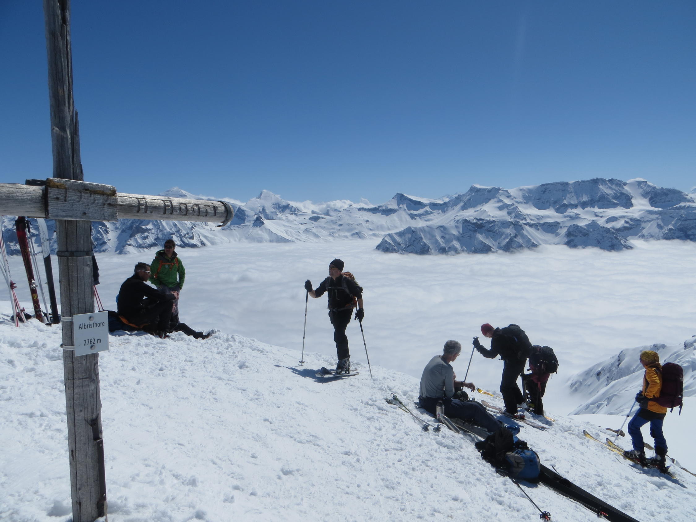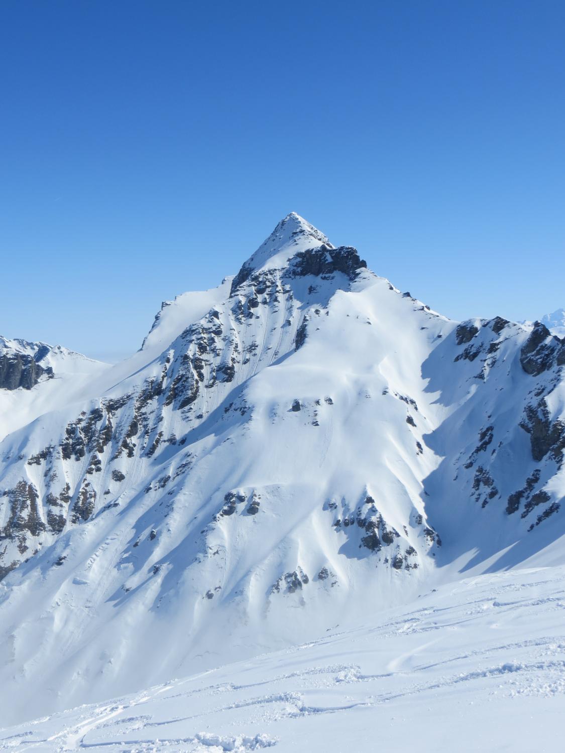 sehr gute Verhältnisse, nordseitig noch schöner Pulver. Am Grat besser die Skis ein paar Meter tragen, gute Trittspuren vorhanden.