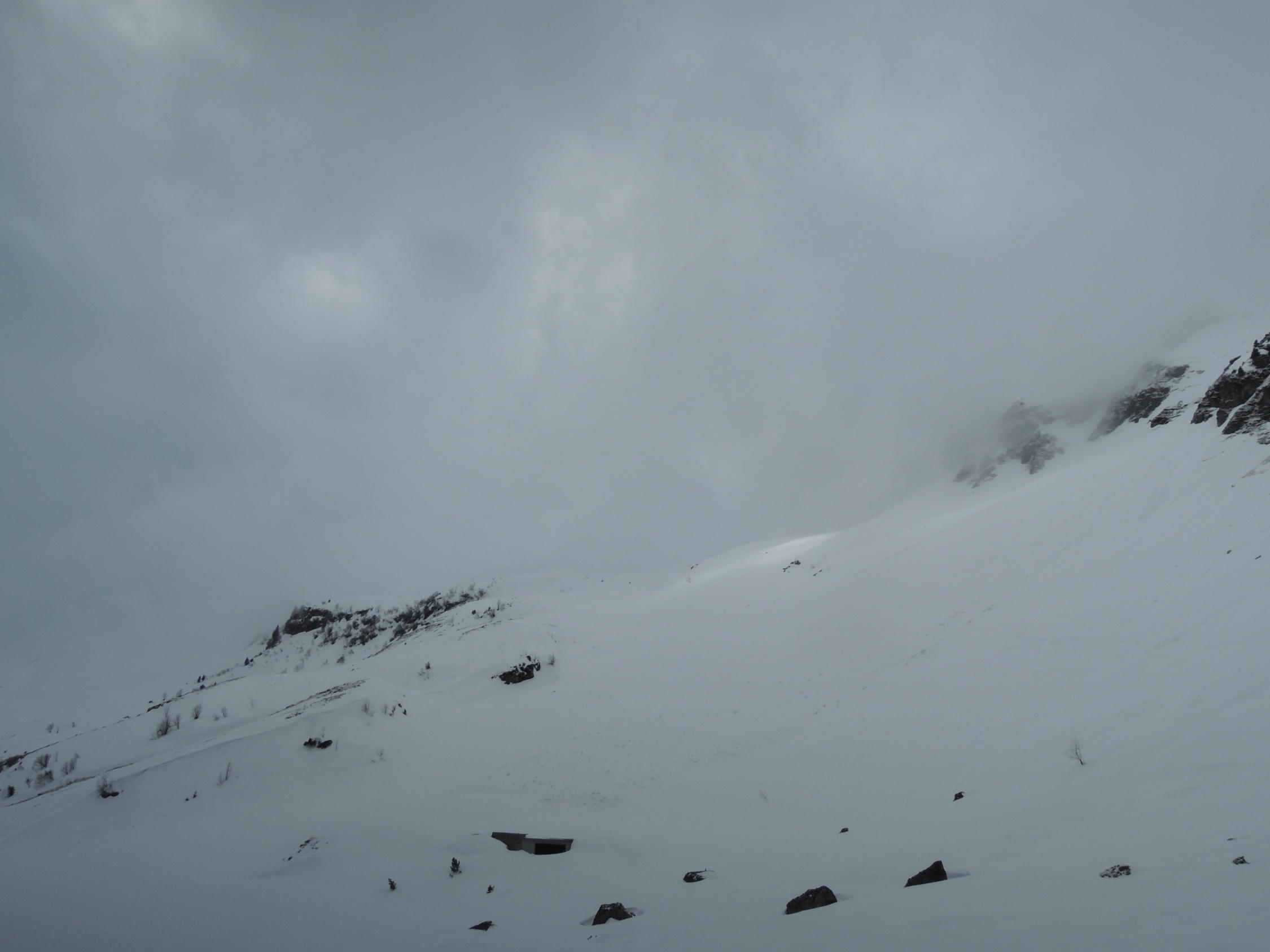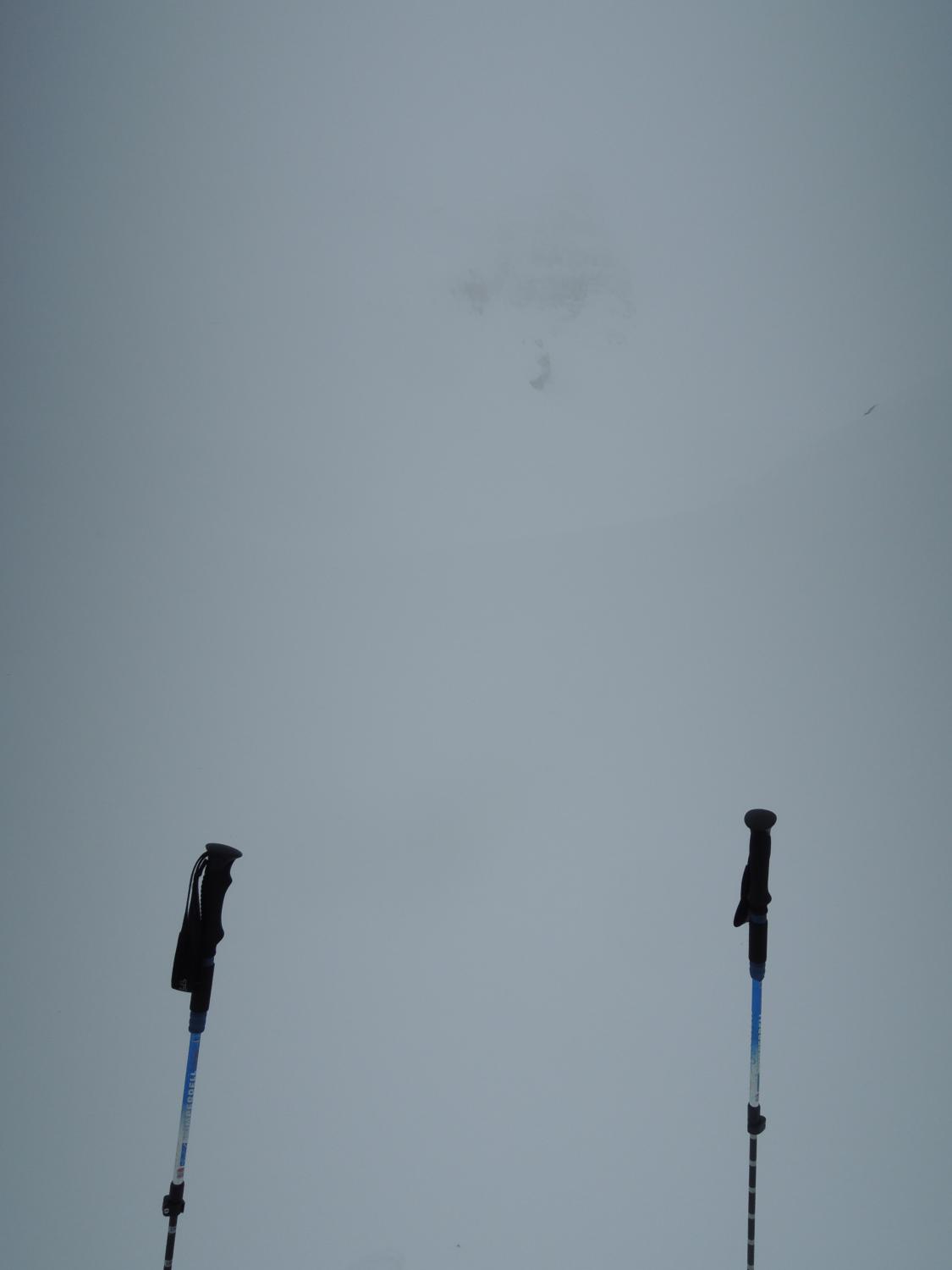 Auf 1965m umgekehrt. Z.T. ordentlich Triebschnee in den Hängen. Bei der Sicht war mir das dann zu heikel.