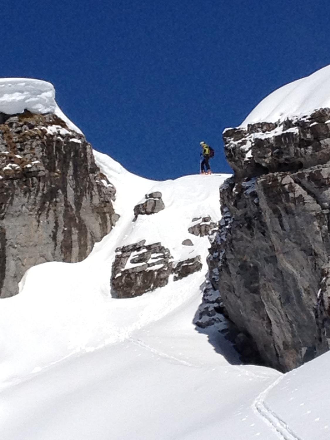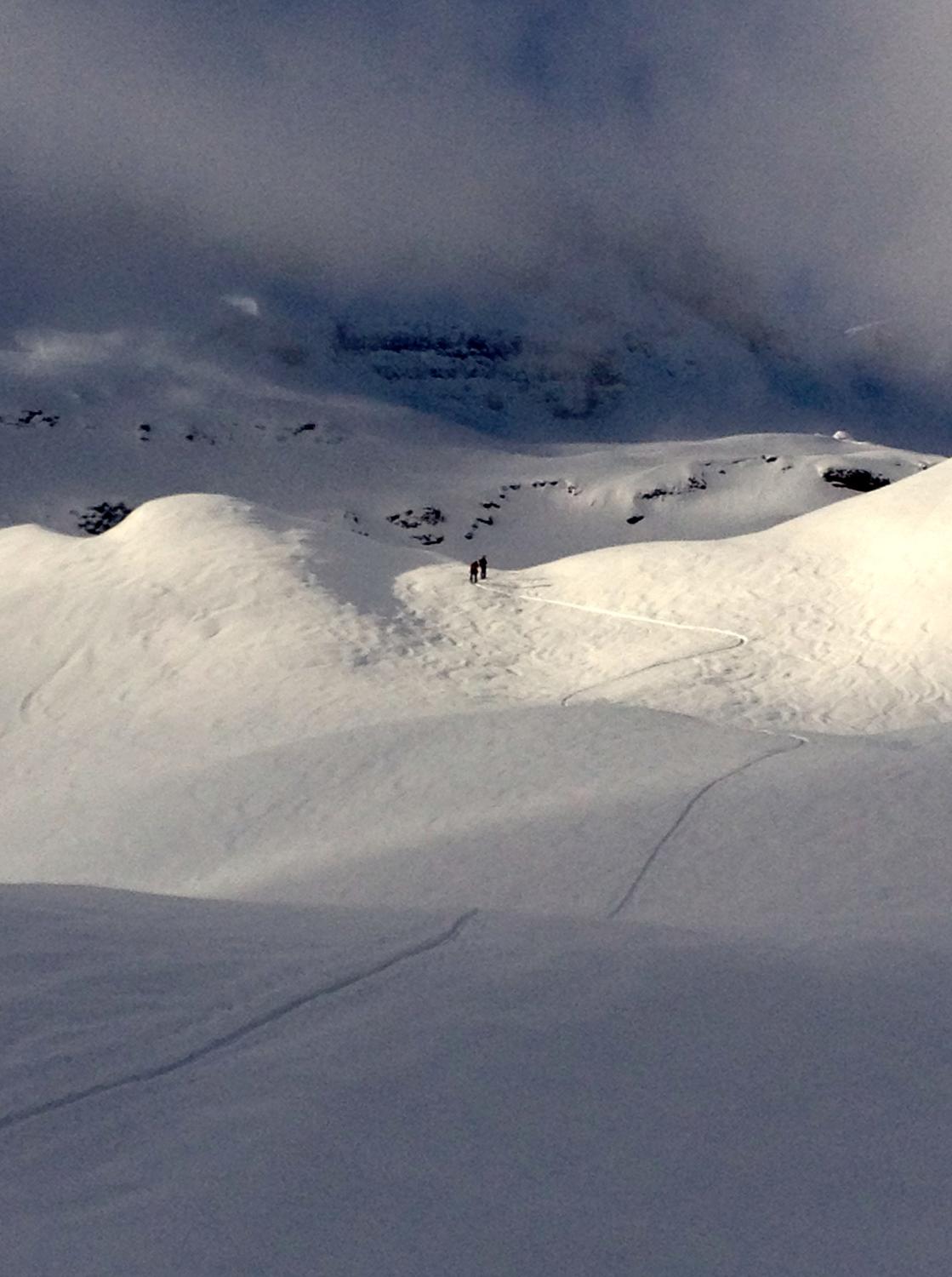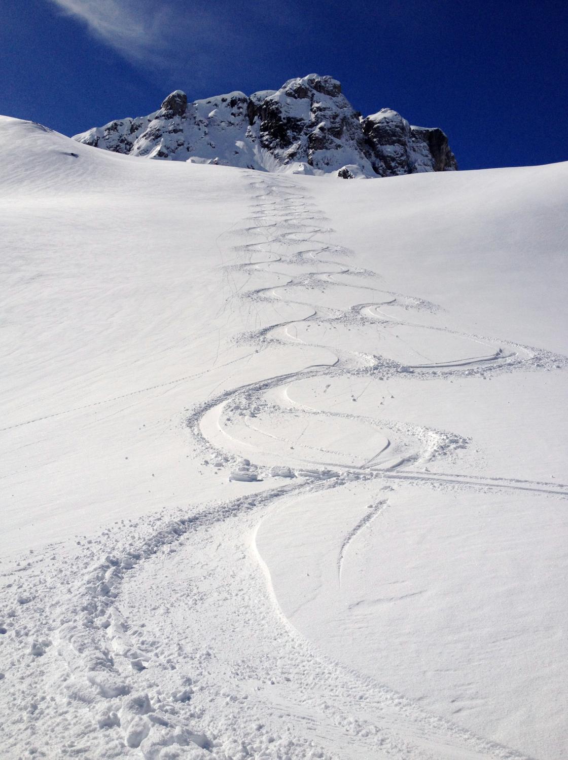 Oben Superpulver auf harter Unterlage, Mittelteil Pulver auf leicht nachgebender Unterlage (noch nicht optimal verfestigt), im Wald noch genug Schnee bis Sali