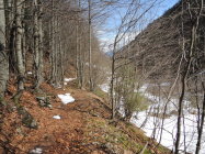 Abfahrt: Zugegeben, wir haben uns hinreissen lassen anderen Abfahrtsspuren zu folgen ohne wirklich ganz genau in die Karte zu schauen. Dachten wir würden in etwa auf Route 840b oder 840c abfahren. Letztlich sind wir nordöstlich recht steil Richtung P. 2107 gefahren. Nach einer steilen Querung dann weiter östlich an P. 2062 vorbei, um dann etwa auf 1800m auf die reguläre Abfahrtvariante der Route 840a zu stossen. Weiter zum Tobelbach runter. Entlang des Baches abzufahren lohnt definitiv nicht mehr! Habe mir die Ski mit reichlich Kratzern dekoriert. Der Schnee ist grösstenteils weg. Besser gleich auf den Wanderweg gehen und zur Tobelbrücke laufen. Dann auf dem Wanderweg in etwa 45 Minuten (265 Hm) zu Fuss zum Berghaus Malbun zurück.