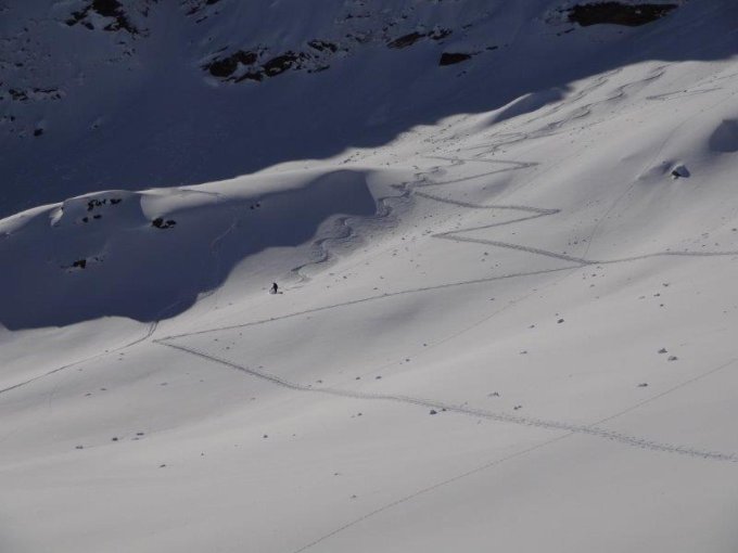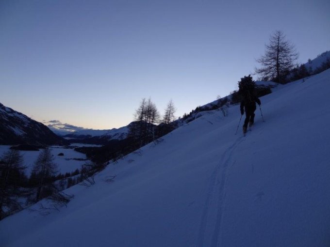 Von Maloja bis Plan di Cavai und etwas höher Schneedecke nicht wirklich tragend. Immer wieder durchbrechen. Ab 2100m bis Gipfel Pulver gut. Die Ebene Murtairac bei unserer Abfahrt leicht aufgefirnt.