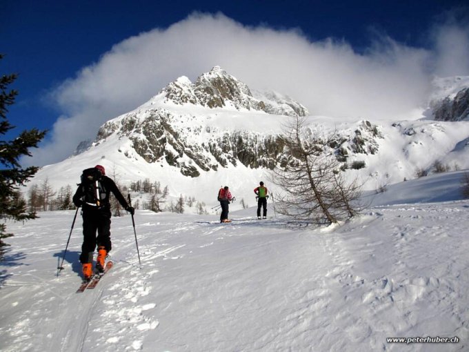 Schöne Abfahrt, oben Pulver, dann feucht und unter 2'500 m sehr feucht und tief. Die Abfahrt durch das Bachbett ist fast pistenartig ausgefahrten, tiefer Sulz.
