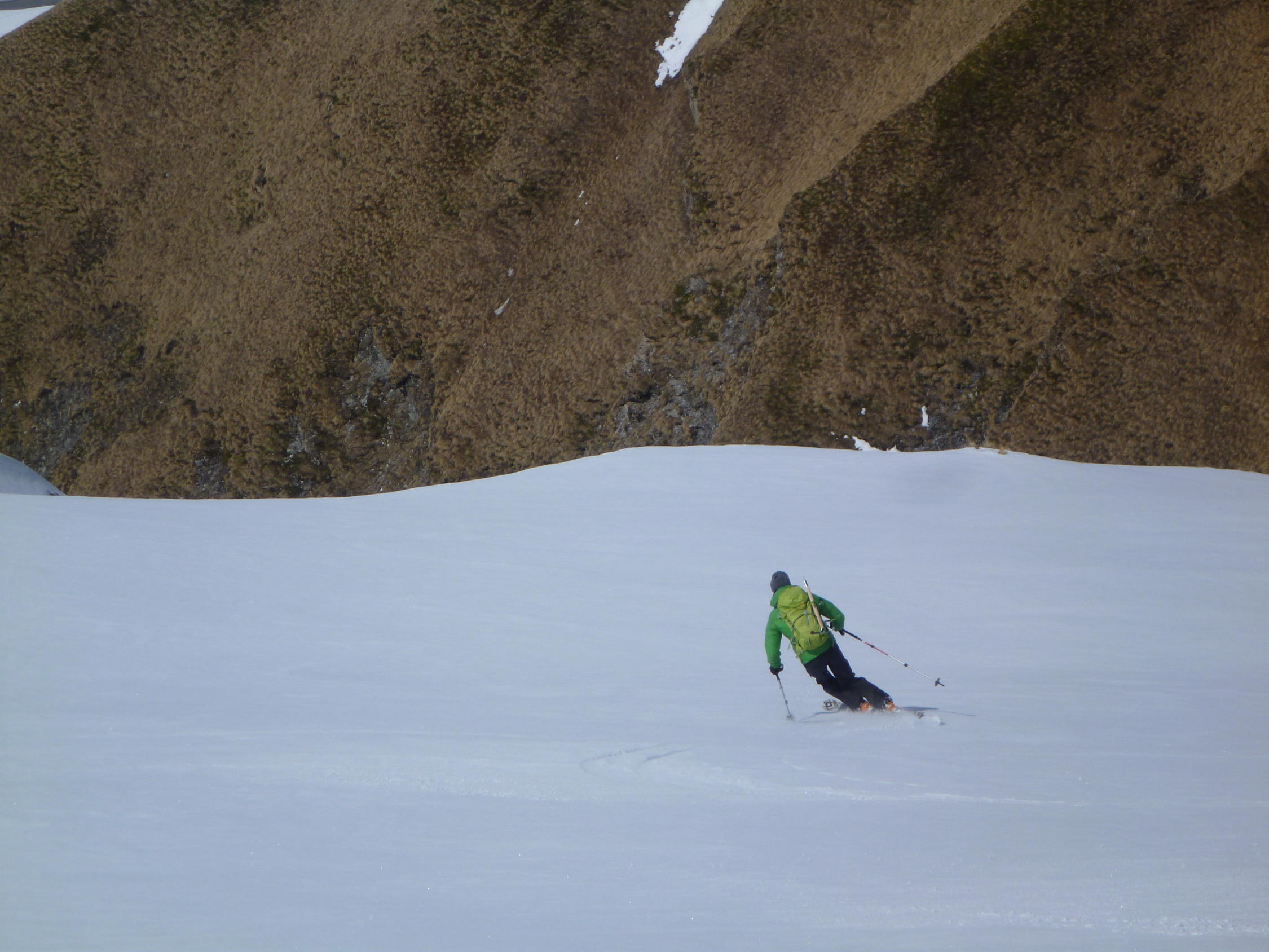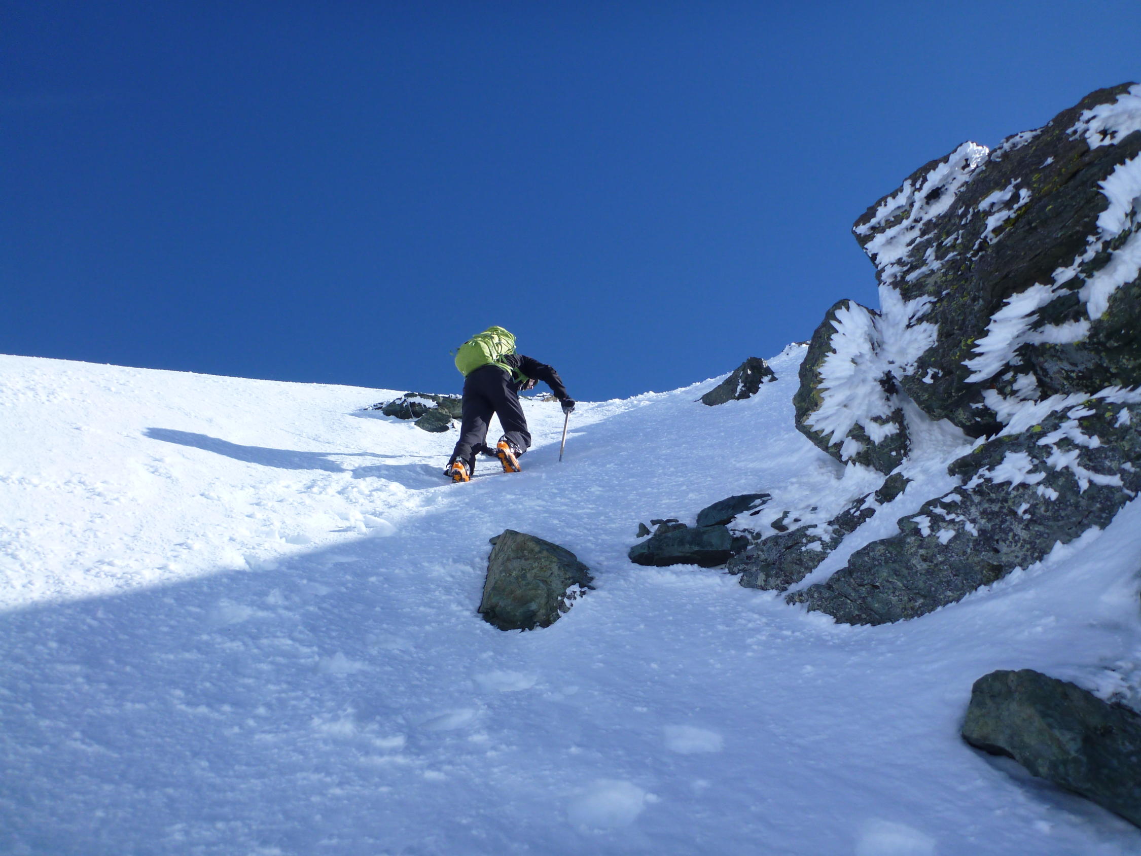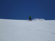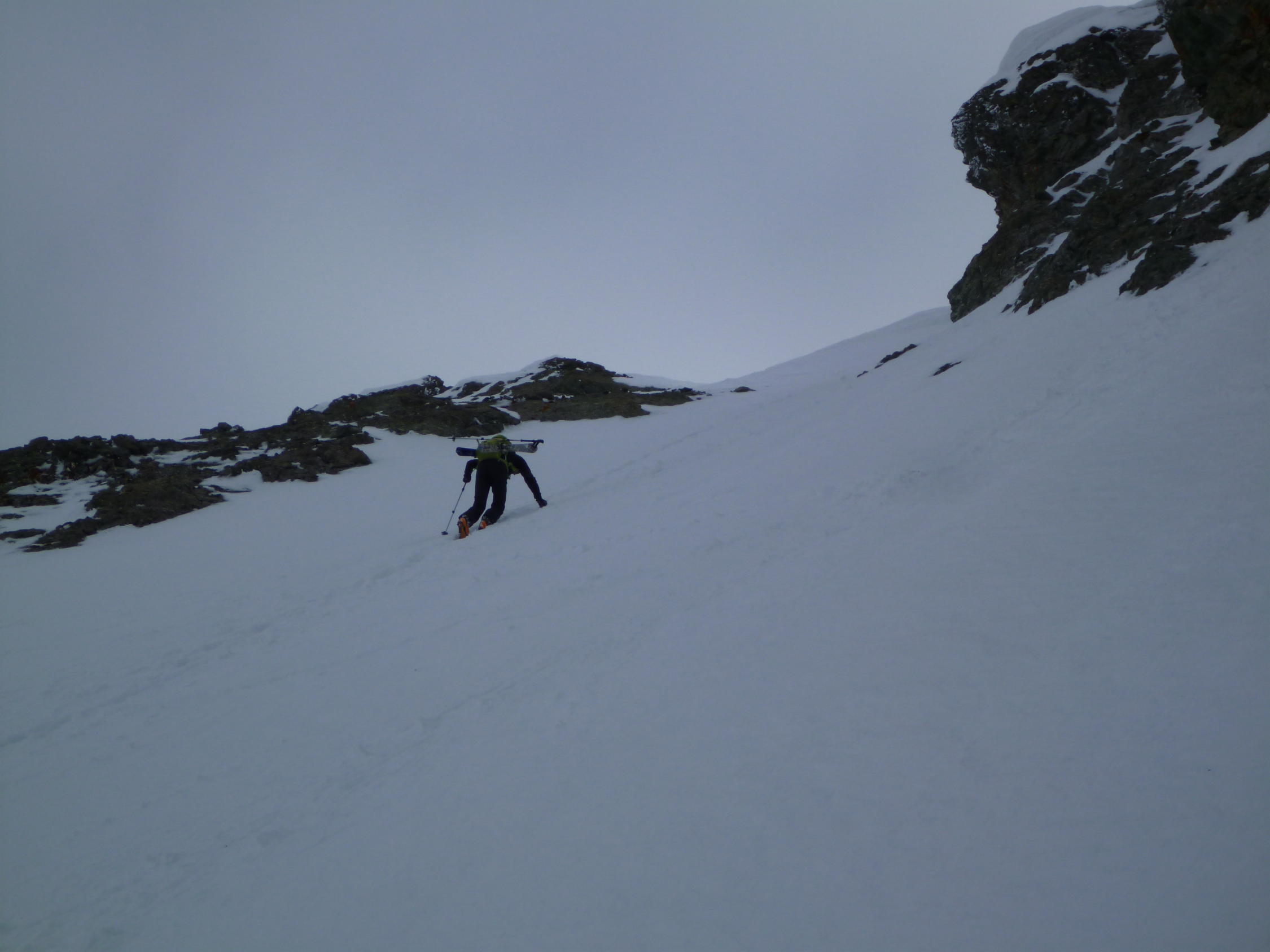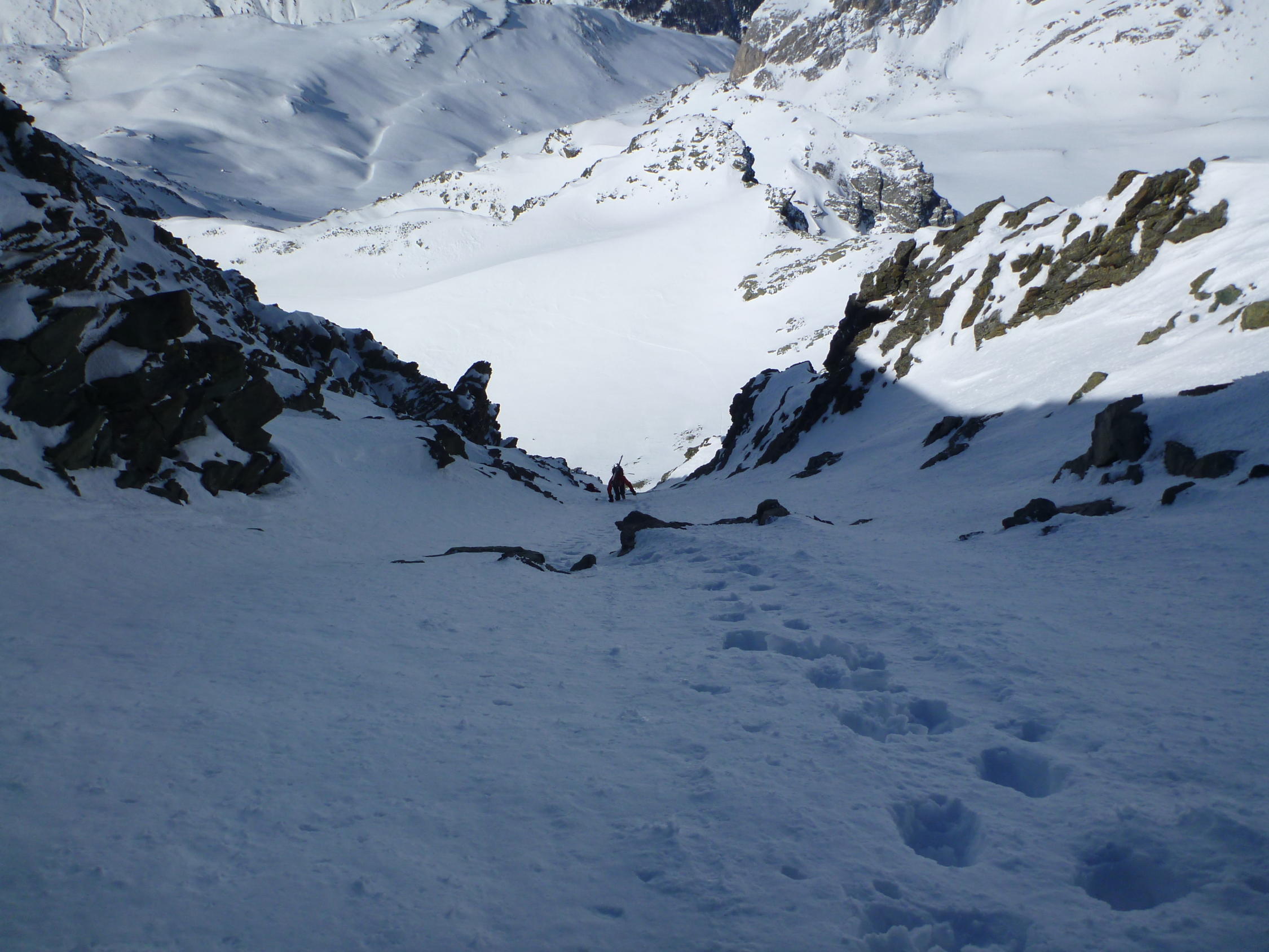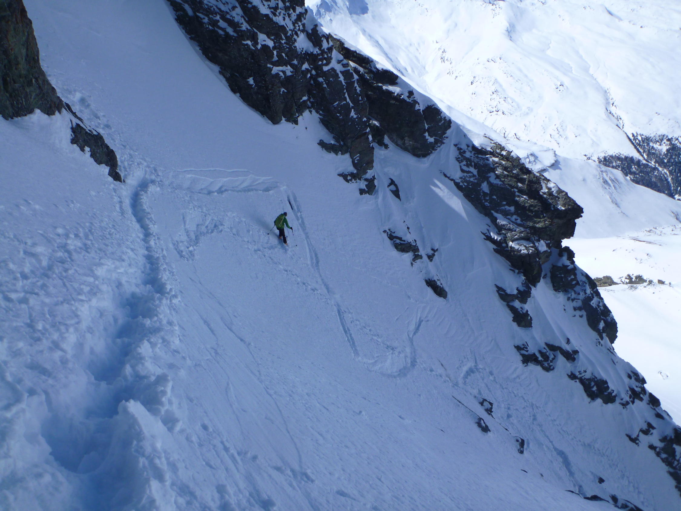 Super Verhältnisse, am Morgen trotz bedecktem Himmel hart gefrohren. In den Couloir sehr guter Trittschnee, sodass Steigeisen bei uns nicht zum Einsatz kamen. Pickel sehr empfehlenswert. Start Abstieg eintlang der Aufstiegsroute ca 10 Uhr war sehr gut, wenn man bedenkt, dass der Abstieg bis zum Skidepot doch nochmals einiges an Zeit kostst. Weiter unten trafen wir traumhafte Sulzhänge an, die wir genau richtig erwischten.
