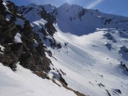Die Abfahrt war entsprechend spät (13.00 Uhr), aber dennoch angenehm. Zuerst ein Paar Kurven Pulver im Gipfel-Kessel, rasch übergehend zu Bruch-Harscht. Die Schlüsselstelle war natürlich nicht tragend und somit konnte man nur vorsichtig hinunterrutschen.