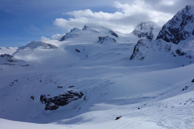 Von der Britanniahütte bis auf den Gipfel gut zu gehen. Im Steilhang nach dem Adlerpass sind die meisten mit Harscheisen gegangen, ist bequemer. Skidepot auf 4150m, dann (auch ohne Steigeisen aber weniger bequem) auf den Gipfel. Adlerpass auf der Zermatter Seite gut fahrbar, Blankeis sichtbar aber gut umfahrbar. Der Steilhang vom Pkt. 3954 direkt sieht auf dem südlichen Ende auch gut aus (nicht blank).