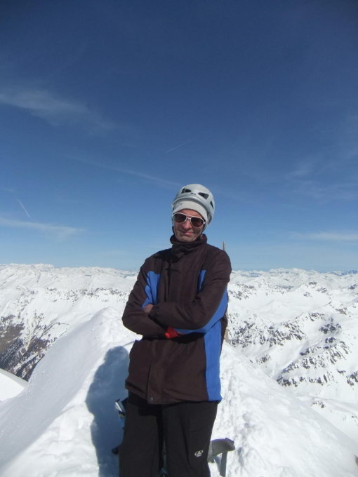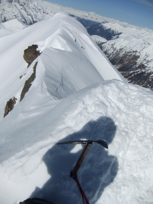 Von der Hütte bis zum Skidepot und von dort auf den Gipfel haben die ersten Aufsteiger des Morgens dankenswerterweise schon gespurt. Der Tiefschnee im Berg machte die "neuralgischen Punkte" (Absturzgefahr) beruhigend.