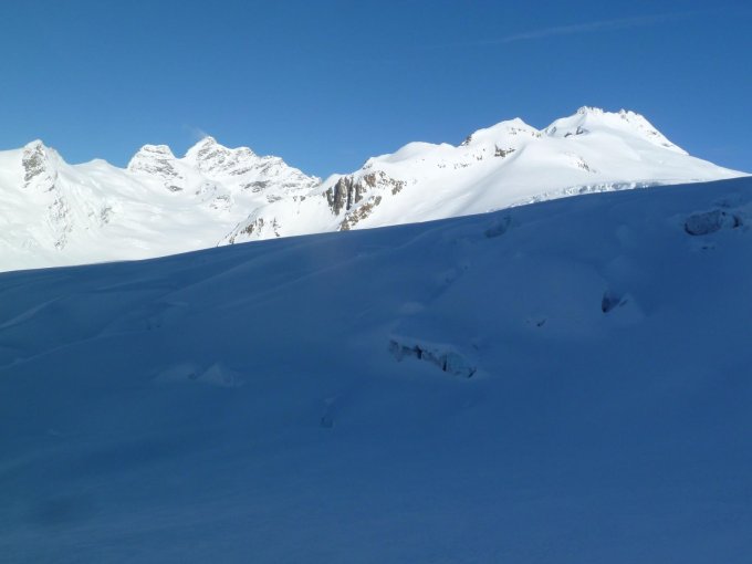 Der viele Neuschnee im Gebiet hat sich noch nicht gesetzt. Der Aufstieg über die Ostflanke aufgrund des fehlenden Harschdeckels recht mühsam. Wegen eines frischen Lawinenanrisses im Gipfelhang (Richtung Südabfahrt) am Skidepot umgekehrt. Der Schnee wird bei der Abfahrt entlang der Aufstiegspur zum Konkordiaplatz gegen 11:00 Uhr schon schwer.