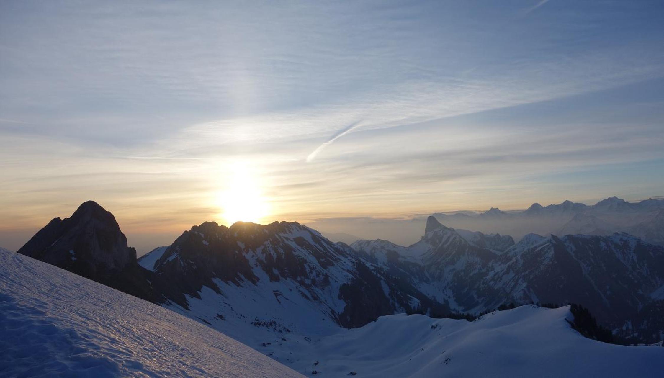Schneedecke durchfeuchtet aber leider zog die Bewölkung offenbar zu spät ab, es gefror nicht. Ab 1800m oberflächlich gefroren, aber nicht tragend. Der Morgetepass sieht ganz strub aus, deshalb sind wir dann zum Sattel zwischen Schibespitz und Gantrisch aufgestiegen (ca 2030m).
