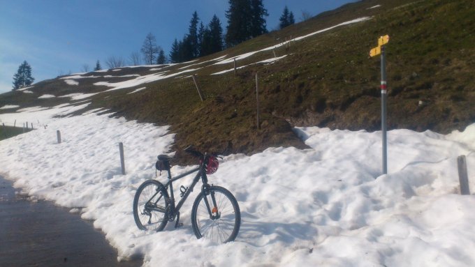 Strasse schneegeräumt (seit heute) bis Bleiki :-). Ab dort mehr oder weniger Schnee auf Fahrstrasse. Ab Bleiki auf Wanderweg Trail/Hike zum Gipfel. Oder machs wie ich, mit noch etwas Muggis Bike bis auf 1506müM über Wiese (Schnee ausweichen). Spätestens ab Abzweiger Wegweiser Bleikigrat zu Fuss Trail/Hike. Oberhalb nur noch vereinzelte Schneeblätz, denen gut ausgewichen werden kann.