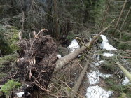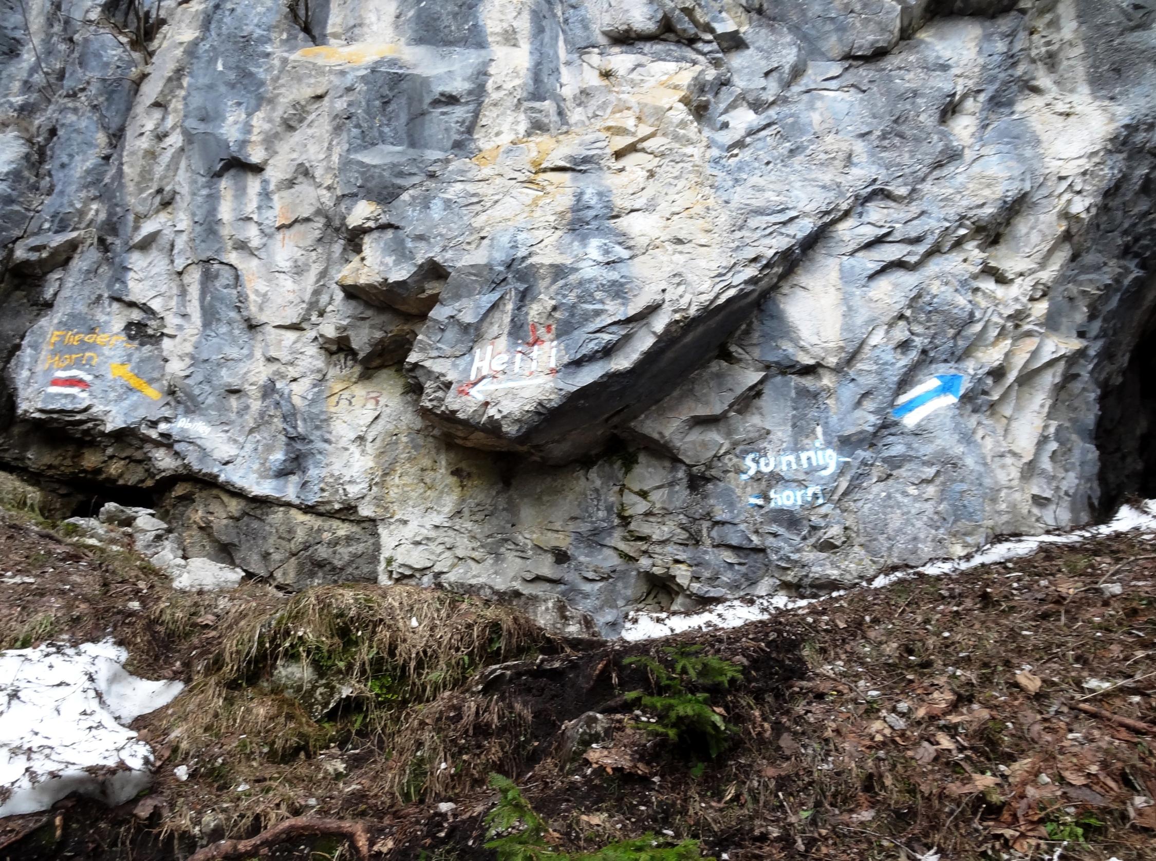 Trocken. Zwischen Fliederhorn und der Grathütte bei den Hürleni, sind durch Sturm gefällte Bäume im Weg. Es braucht ein wenig Fantasie, Akrobatik und Glück um mit heilen Kleidern durchzukommen. Nur kleine Schneeresten. Um den Reutiger, der in seiner Höhle direkt unter dem Gipfel des Fliederhorns (westlich) sitzt, zu sehen, braucht es einen Feldstecher und ein wenig Mut zum Risiko. Er wird von den wachsenden Bäumen langsam verdeckt.