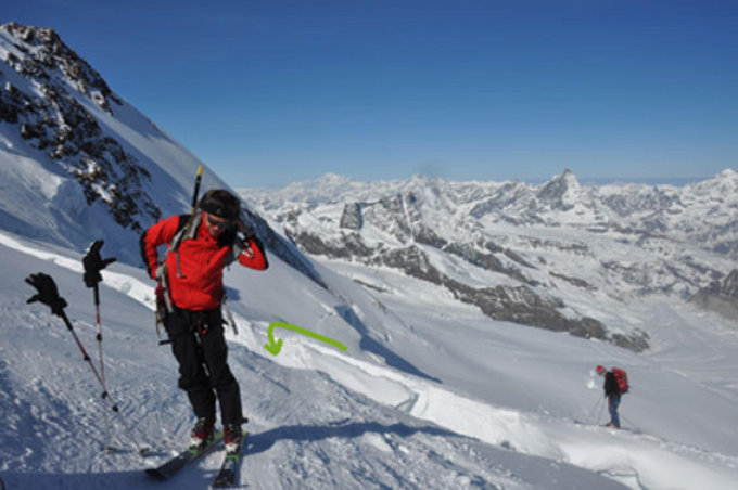 Kurz vor dem Silbersattel hat sich eine Spalte geöffnet, die über eine hässlich dünne Schneebrücke gequert werden muss (diese ist an beiden Spaltenrändern zusätzlich eingerissen)-> -> hier unbedingt und lang anseilen! Da die Brücke in einer Kehre liegt, sollte der Seilzweite nicht auf dem Spaltenrand stehen bleiben, sondern sich so positionieren (die Aufstiegsspur verlassen und in die Gegenrichtung gehen), dass das Seil gestreckt werden kann. Das Problem ist auf der Abfahrt verschärft, da der Schnee oberhalb hart ist.