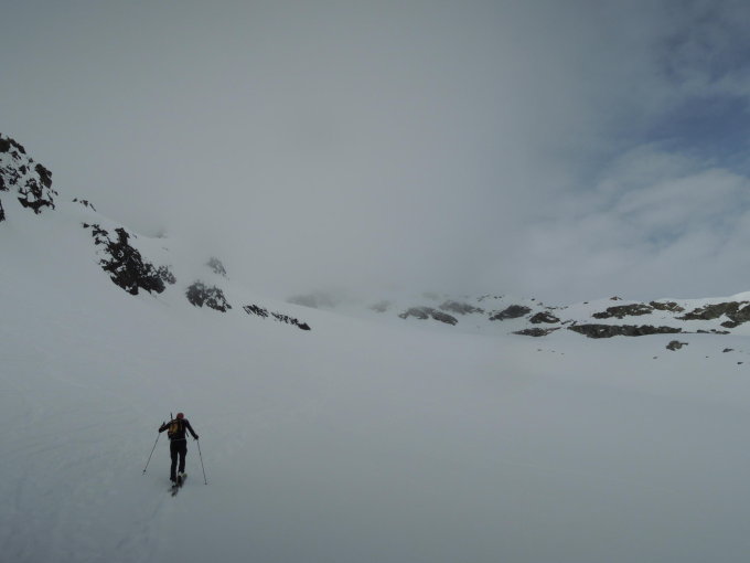 Eine gute Spur ist vorhanden bis zum Wintergipfel (Nordgipfel) bei P. 3109. Die Abstrahlung über Nacht war nicht ausreichend für eine tragfähige Auflage. Ab ca. 2900m dichter Nebel. Deshalb haben wir heute auf den Hauptgipfel verzichtet.