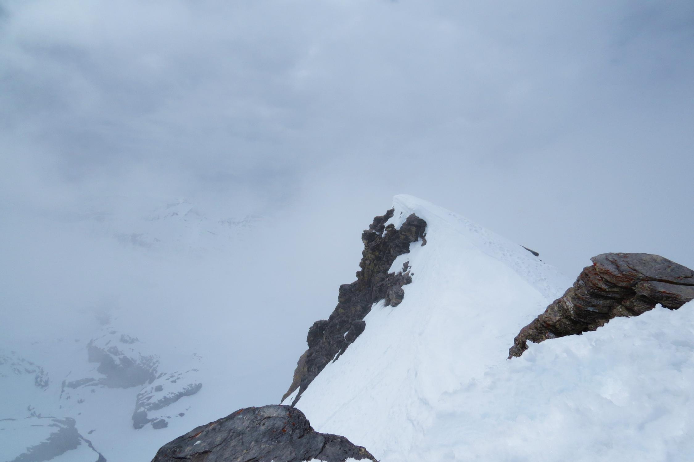 Aufgrund der fehlenden Abstrahlung in der Nacht dann von unten bis zum Frühstücksplatz sehr weicher Schnee. Frühstücksplatz trotz Mega-Wächte gut machbar. Die letzten Meter je nach Technik zu Fuss oder mit den Skis machbar. Abfahrt dann Dito. Ab Früstücksplatz etwas bessere Schneeverhältnisse. Auf der Fläche dann Hart bis leichter Deckel mit leichten Windverwehungen. Zu diesem Zeitpunkt hat sich dann das Zwichenhoch auch wieder verabschiedet und wir genossen den Schneefall mit plötzlichen Nordwind und Null Sicht.