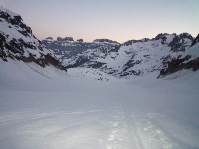 Es hat in der Nacht gut abgefirnt, reichlich Schnee im Gebiet und die Gletscher sind sehr gut eingeschneit. Gletscheraufschwünge problemlos und ohne Pickel und Steigeisen, oder Harscheisen möglich da gute Spur vorhanden.