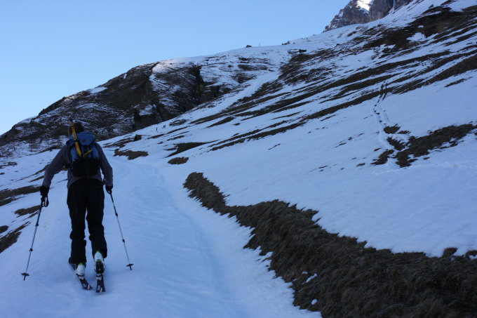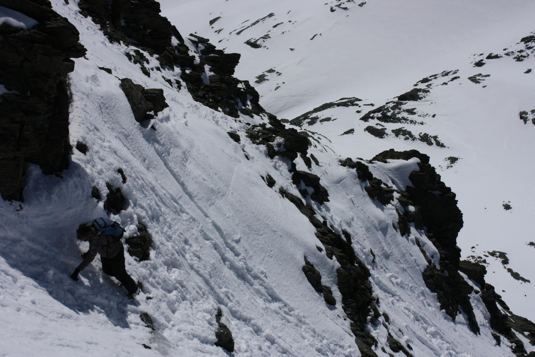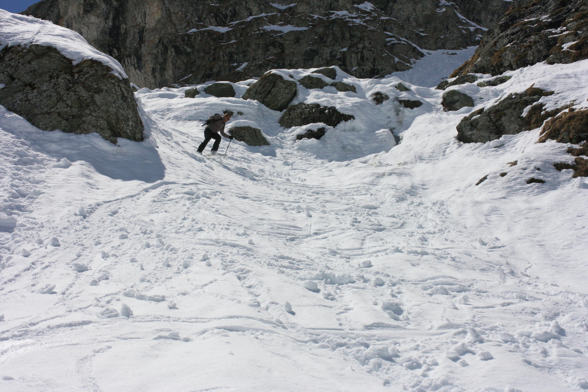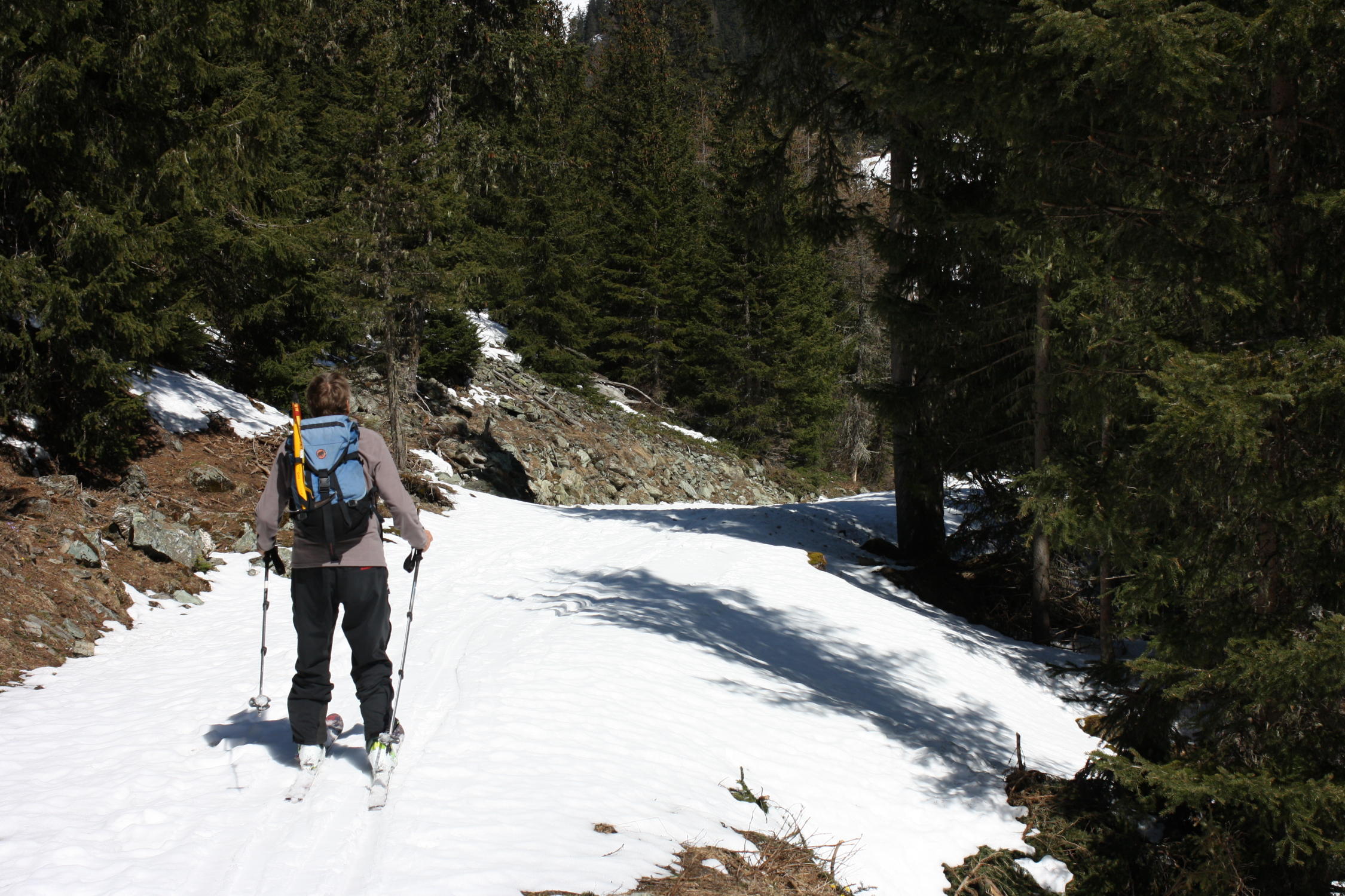 Nach kalter Nacht gesamter Aufstieg mit Harscheisen. Genügend Schnee bereits ab Ausgangspunkt in Pürt. Couloirs ohne Steigeisen machbar, im Abstieg vom Gipfel jedoch empfehlenswert. Schnee auf der Abfahrt bei großer Wärme wenig gesetzt, schwer und durchweicht, aber fast bis Mulegns befahrbar.