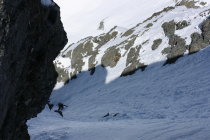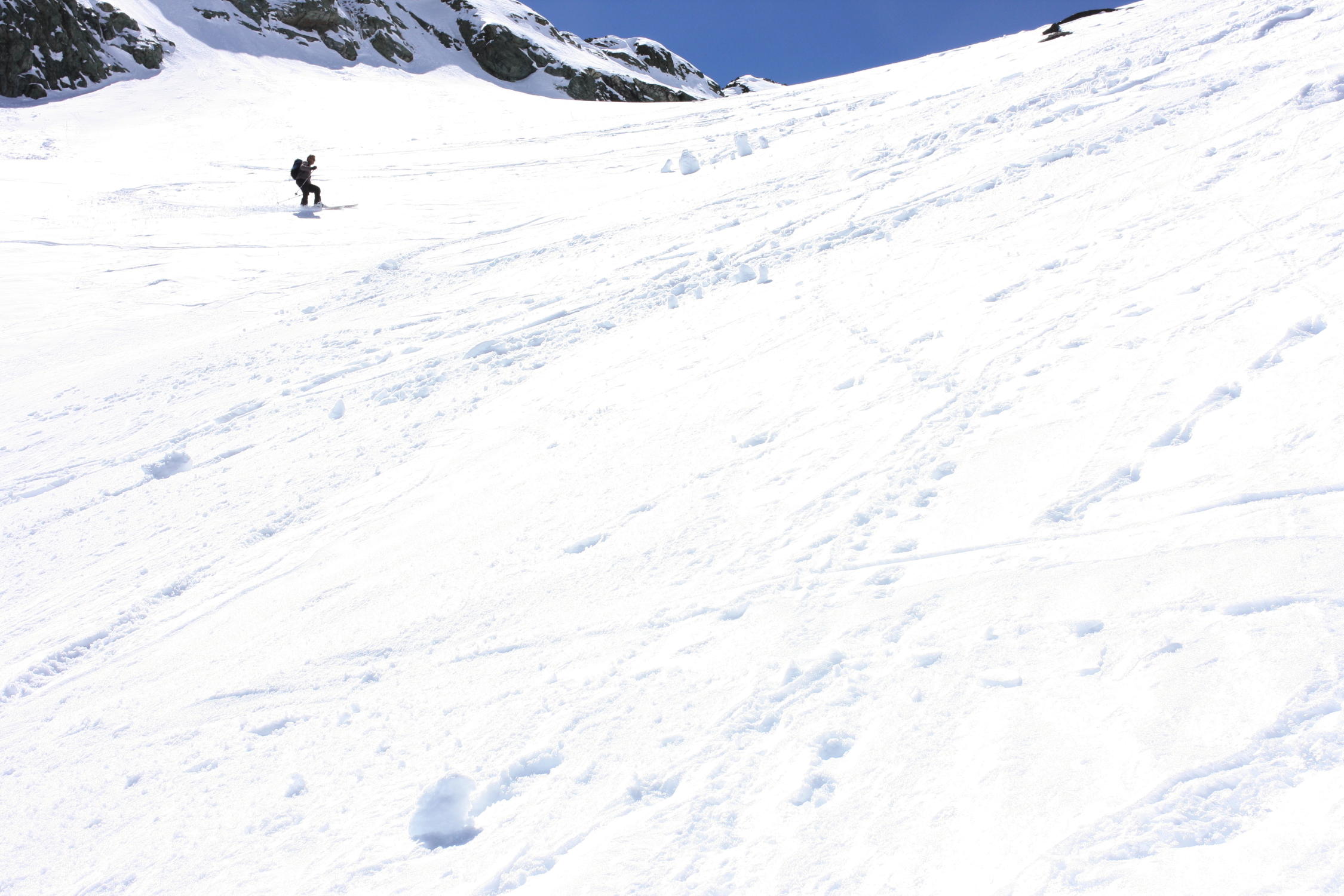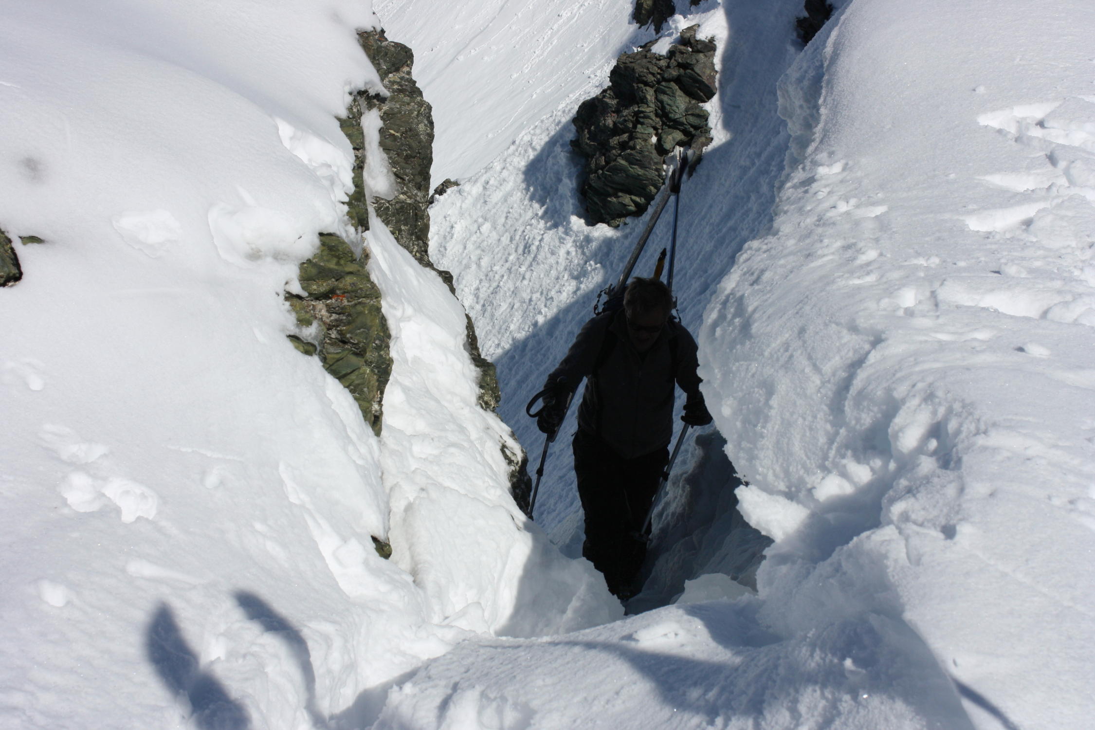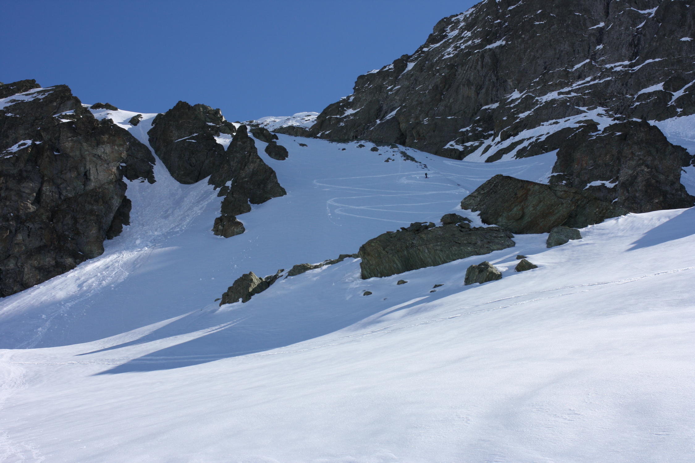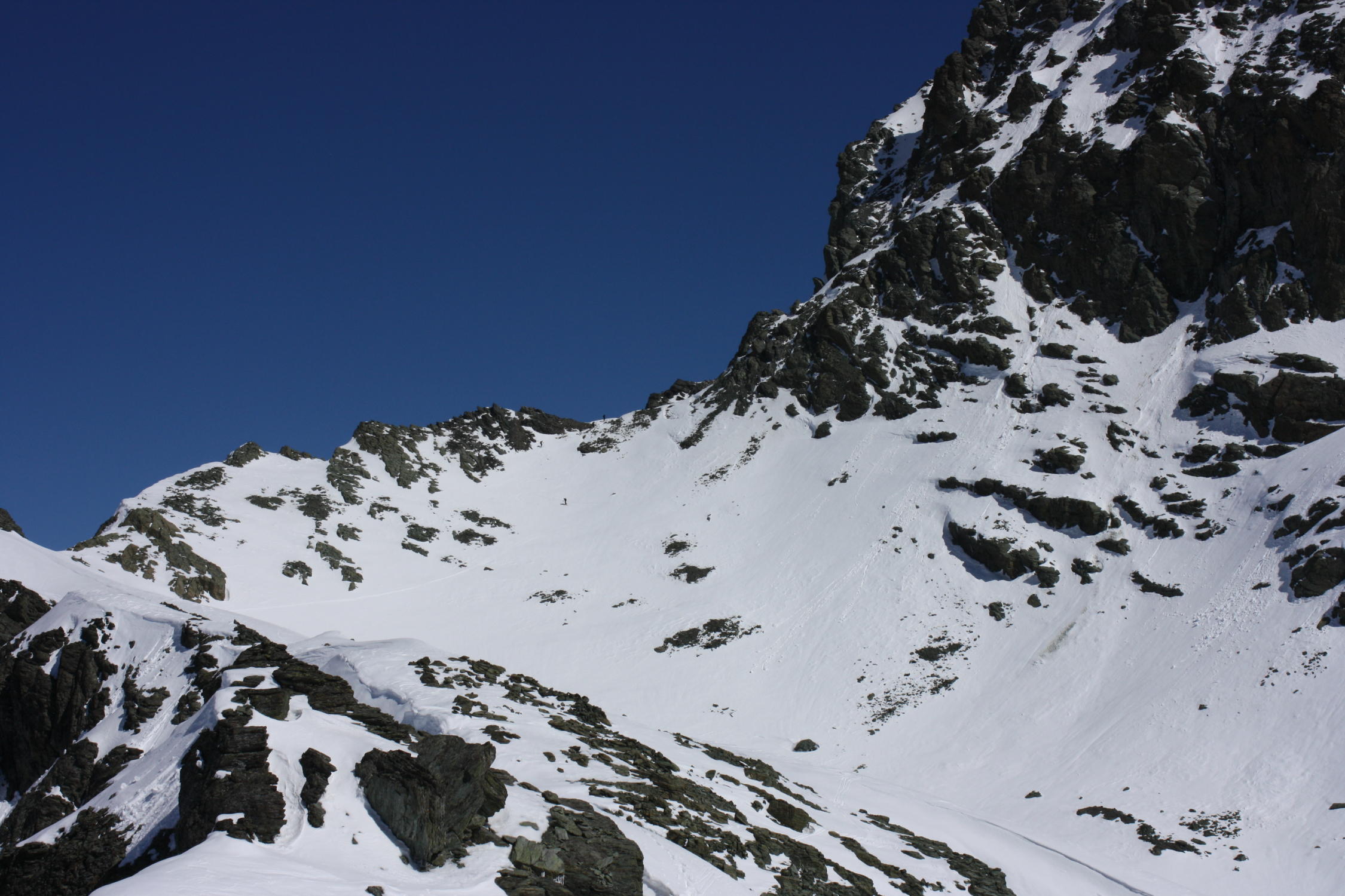 Nach kalter Nacht gesamter Aufstieg mit Harscheisen. Genügend Schnee bereits ab Ausgangspunkt in Pürt. Couloirs ohne Steigeisen machbar, im Abstieg vom Gipfel jedoch empfehlenswert. Schnee auf der Abfahrt bei großer Wärme wenig gesetzt, schwer und durchweicht, aber fast bis Mulegns befahrbar.