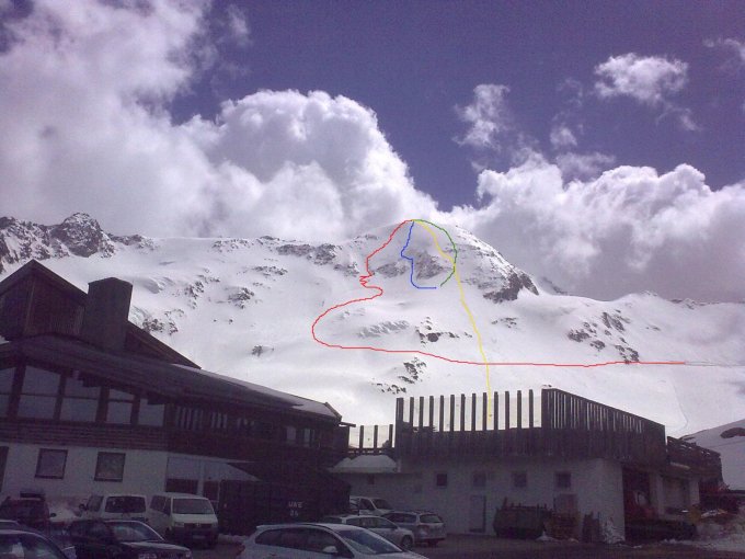 Ich bin zunächst im östlichen Wandteil zum Gipfel gestiegen (auf dem Foto rot) und dann zentral die Wand durch die kleinen Eisabbrüche durch runter (auf dem Foto blau): Pulvrig mit etwas Neuschnee, meist gut zu fahren, nur oberhalb der Eisabbrüche kurz Windharsch. Im Eisabbruch habe ich einen Durchschlupf mit etwas Eiskontakt gewählt (1-2cm Schnee auf Eis, kein Problem mit guten Kanten), es hätte aber auch einen Durchschlupf ohne Eiskontakt gegeben.