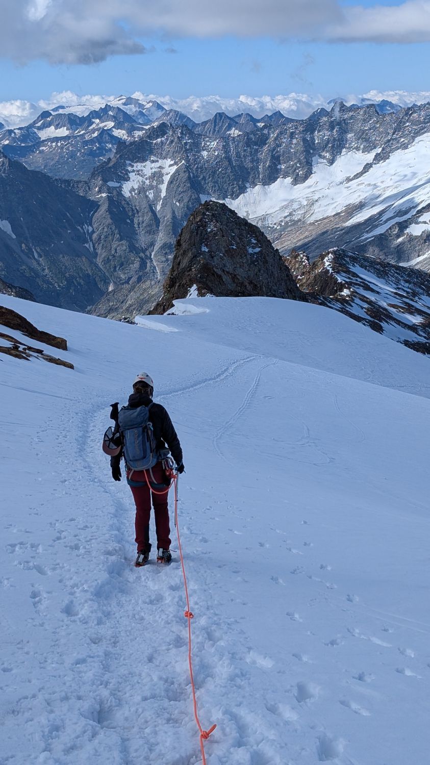 Derzeit noch sehr gute Verhältnisse am Steingletscher. Der Gletscher ist noch durchgehend bedeckt, einige Spalten schauen schon halb aus der derzeitigen Spur heraus, Anseilen nicht vergessen.