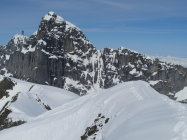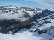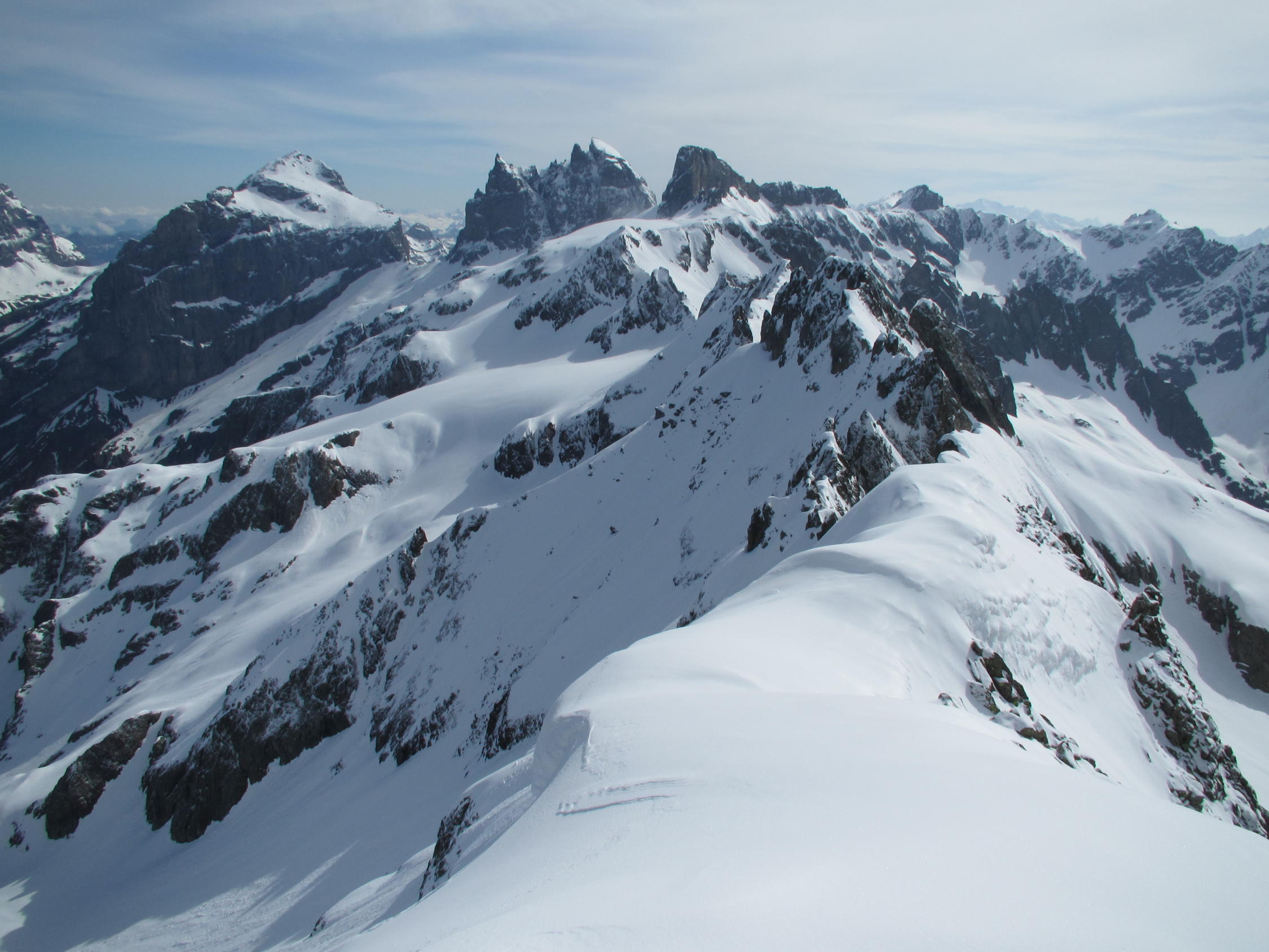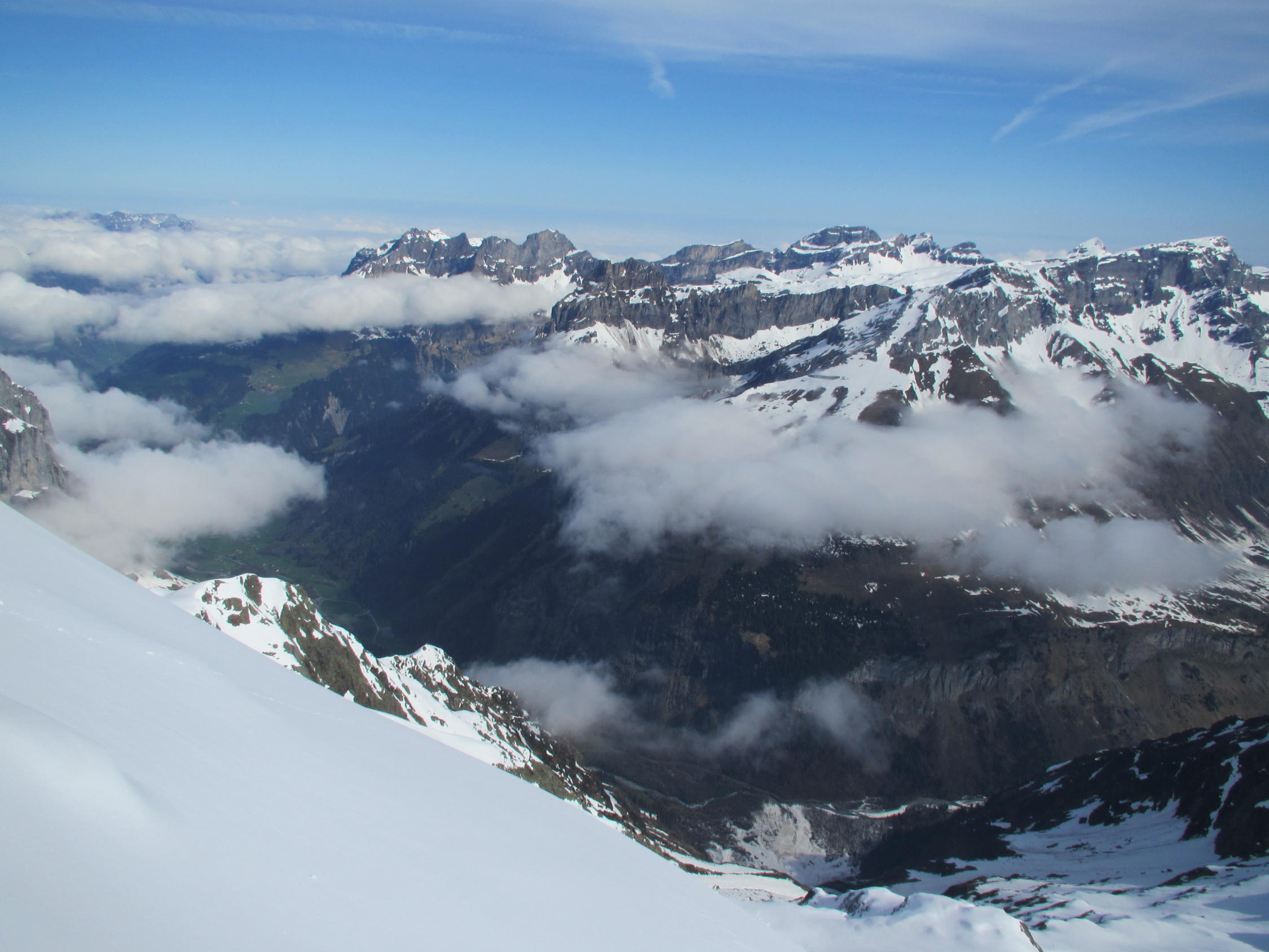 Durch die Chlialp auf knapp tragender Schneedecke nach Wyssgand. Das Couloir das ins Hohbergtal führt, wie meistens stark verlauenet. Einige Schneebrücken in der Rinne sind bald nicht mehr tragend. Im Oberen Hohbergtal, und über den Gletscherabbruch war der Neuschnee "decklig" er konnte nicht richtig durchgefrieren. Auf dem Wichelplanggfirn gute Bedingungen, nur wenig eingesunken. In der Flanke zum namenlosen Sattel hinauf wurde die Spur tiefer. Skidepot unmittelbar beim Bergschrund der sich teilweise geöffnet hat. Vom Sattel über den Gipfelgrat auf den Stössenstock. Vielen Dank dem wackeren Zürcher der heute gespurt hat. Die Sicht war einmalig, nur schade dass ein kalter Wind den Gipfelaufenthalt in Grenzen hielt. Abfahrt über den Firn bis zum Gletscherabbruch sulzig, dann leicht decklig, der Rest auf gut drehbarem Frühlingsschnee.