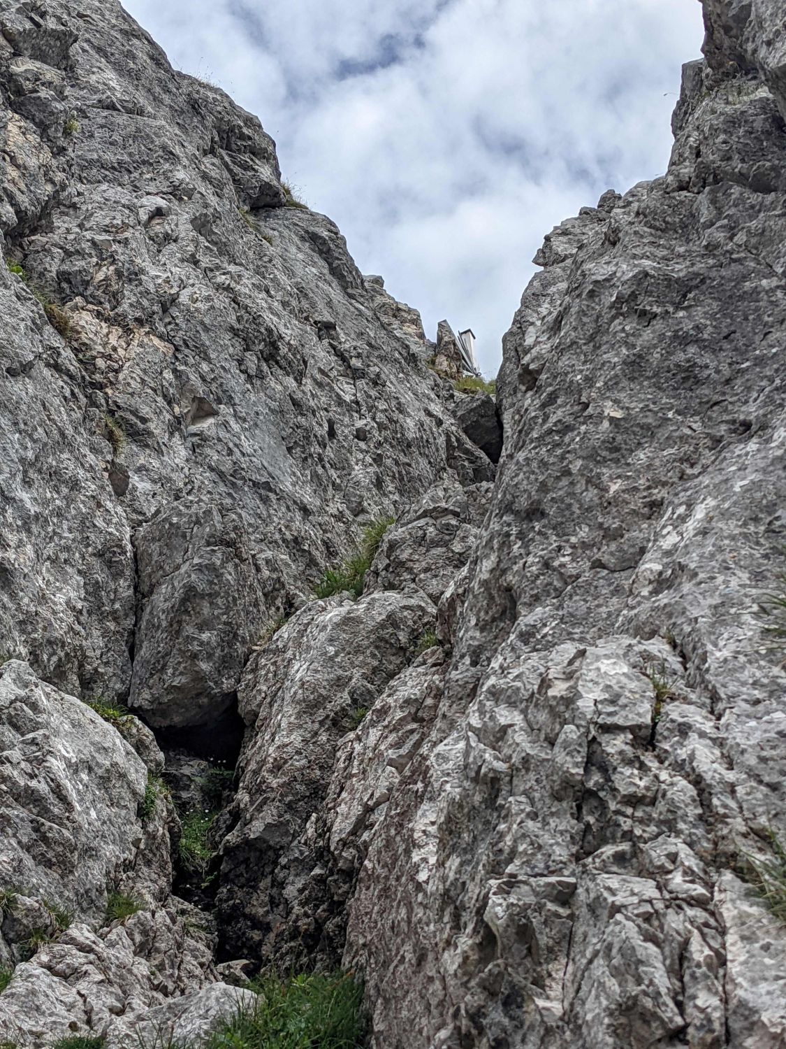 Kletterschwierigkeiten ca. 2+, brüchiger Fels, enge und z.T. senkrechte Kletterstellen, Steinschlaggefahr, unbedingt Helm aufsetzen! Im Abstieg muss überwiegend GZW abgeklettert werden!
