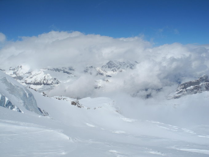 Bis zur Emanuel-Hütte werden die Laufpassagen wahrscheihnlich täglich länger, dennoch guter Schnee. Ab der Hütte liegt genug Schnee. Spalten sind gut zu sehen. Am ersten Gletscherfeld rechts halten.