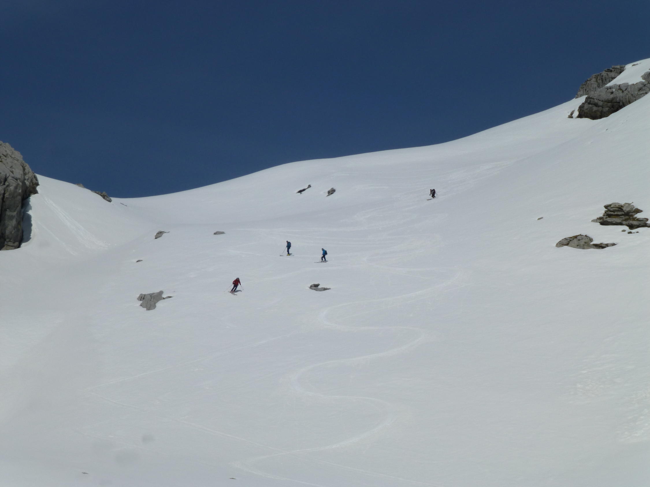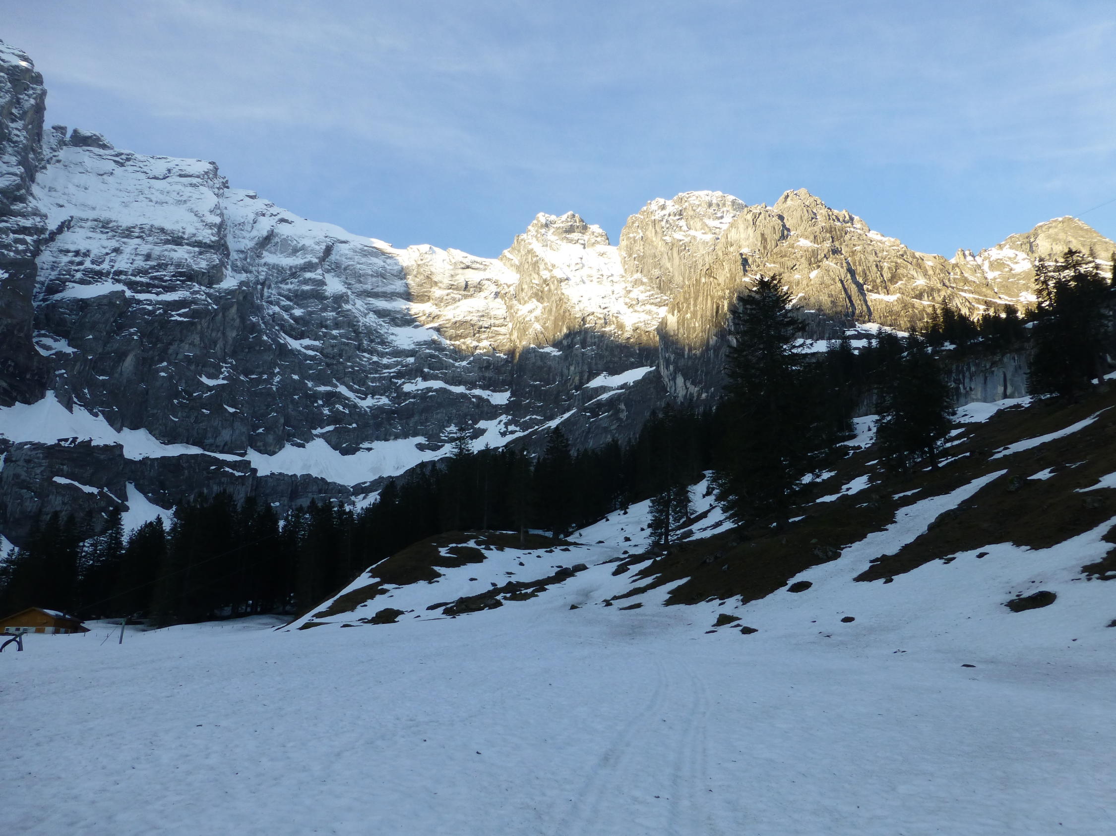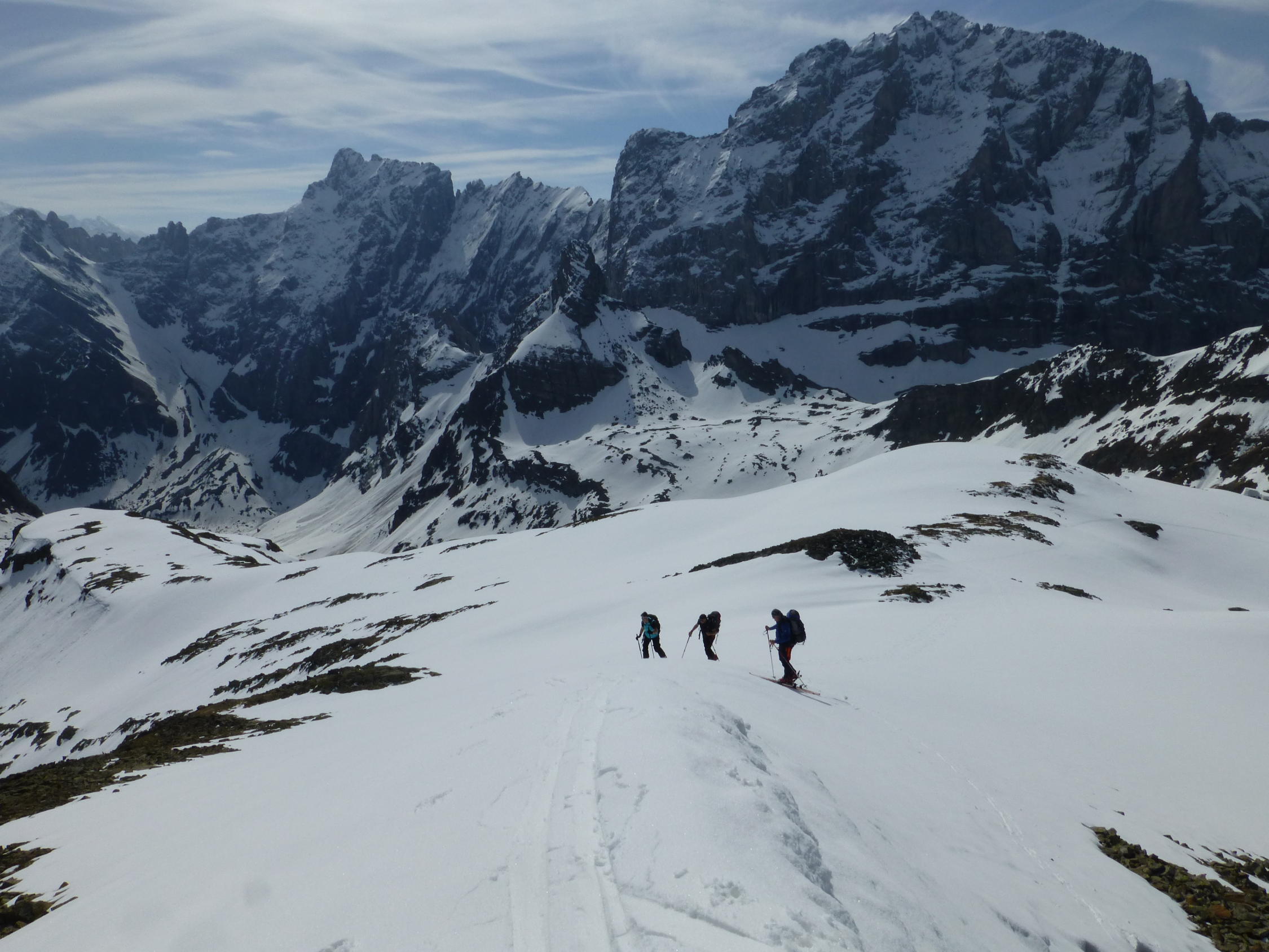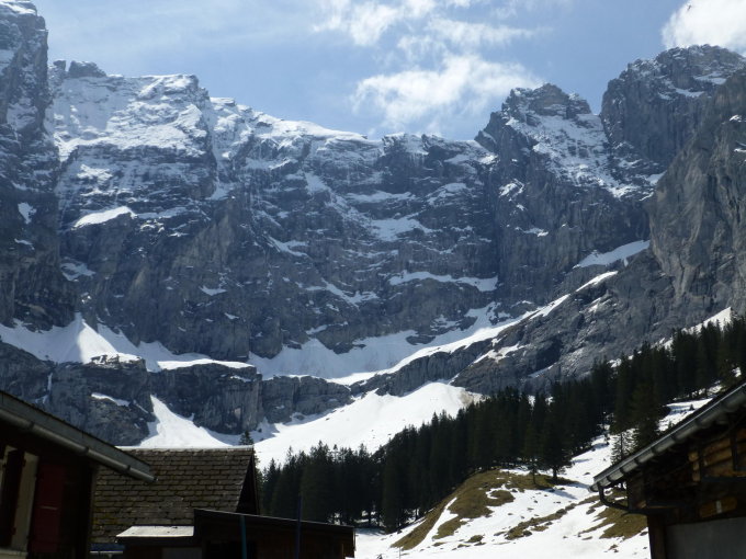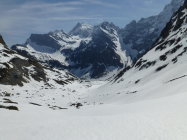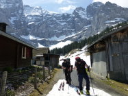 Wir mussten die Skis noch 30 Minuten tragen bis wir sie anschnallen konnten.Es hat noch Schnee auf der Fahrstrasse bis zur Steckenmitte zur Brunniapl,doch ab Brunnialp hat es noch genügend Schnee.Wir waren alleine im Gebiet nur eine Türeler machte noch die Ruchenchäle die wir gut einsehen konnten.Herrlich war der Schnee bei der Abfahrt und wir genossen Ihn mit schönen Schwüngen.