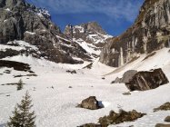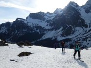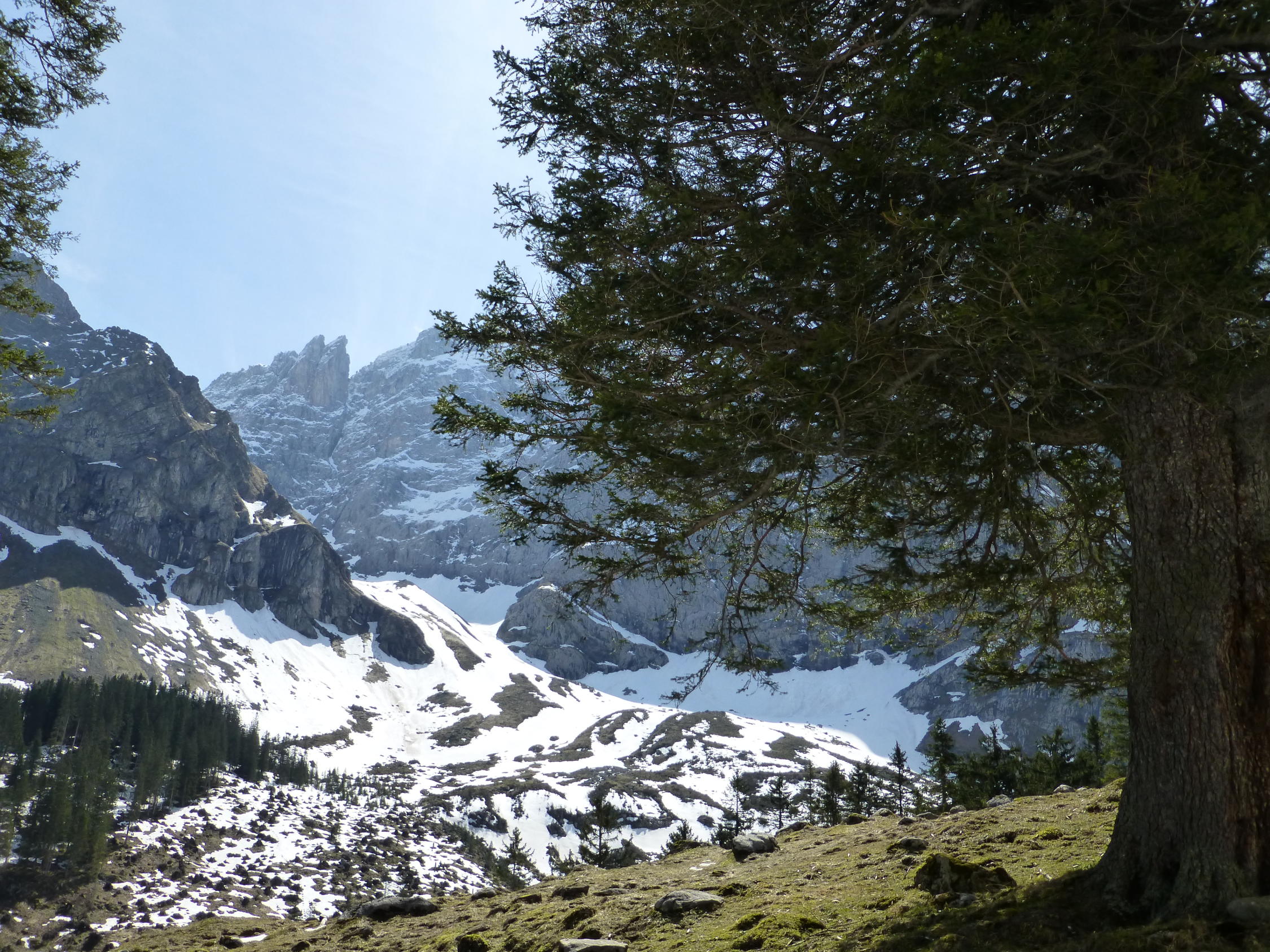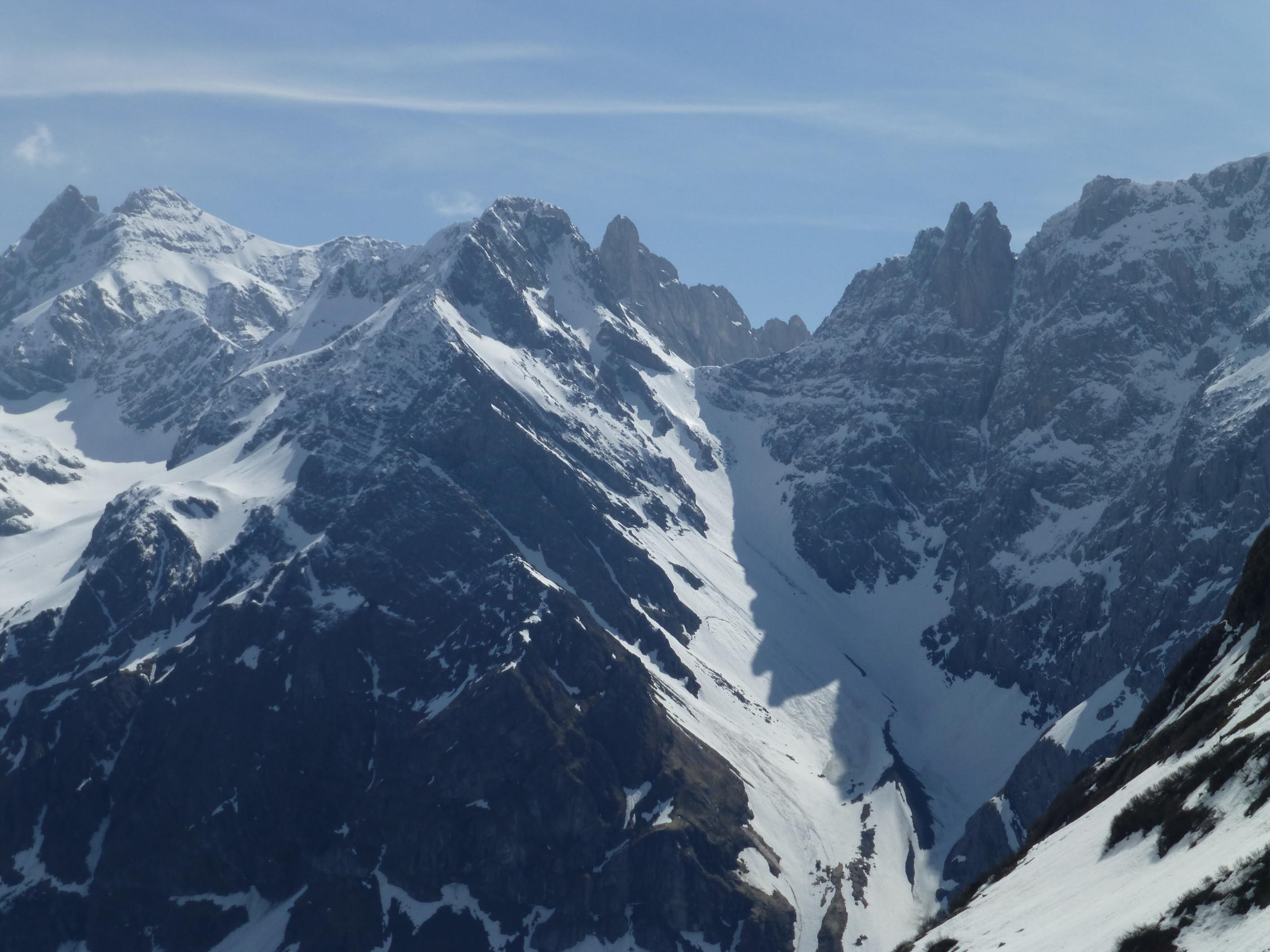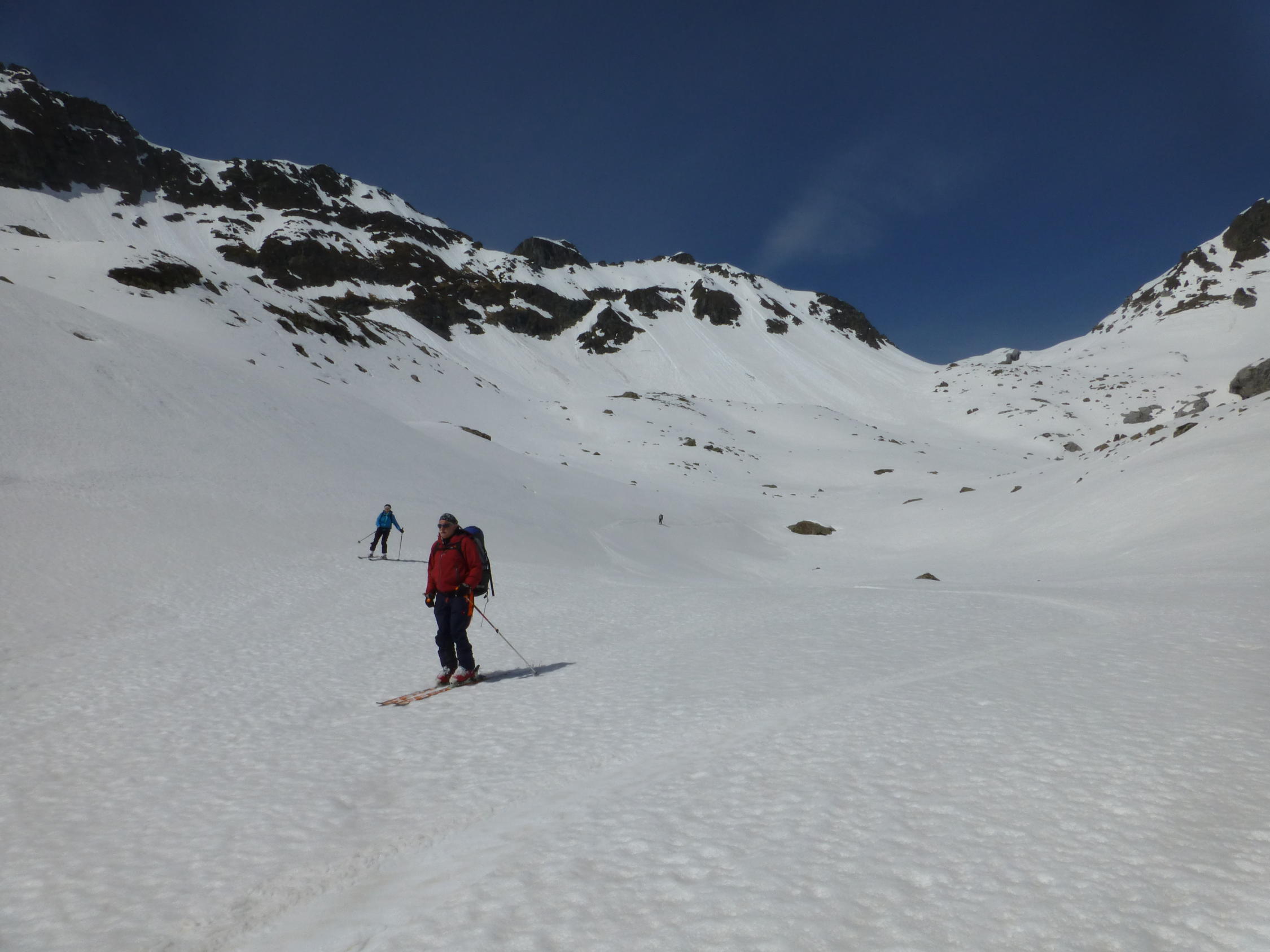 Wir mussten die Skis noch 30 Minuten tragen bis wir sie anschnallen konnten.Es hat noch Schnee auf der Fahrstrasse bis zur Steckenmitte zur Brunniapl,doch ab Brunnialp hat es noch genügend Schnee.Wir waren alleine im Gebiet nur eine Türeler machte noch die Ruchenchäle die wir gut einsehen konnten.Herrlich war der Schnee bei der Abfahrt und wir genossen Ihn mit schönen Schwüngen.