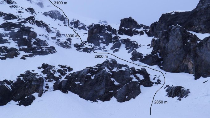 Gesamte Flanke mit Ski abgefahren, in der Flanke leichter Harsch- bis Eisdeckel. Unterhalb 2900 m ist der Schnee weich und durchnässt, ca 3 cm tief eingesunken. Auf 2500 m gut 5 cm engesunken. Zu Fuss bis 1800 m gehbar, da vollständig schneefrei.