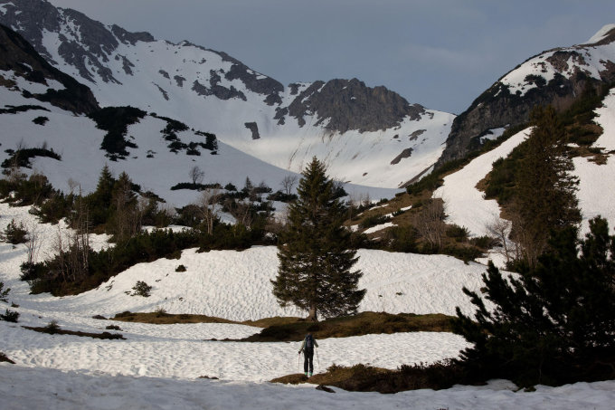 Fahrweg von Tannheim bis Älpele (ca. 500 Hm) seit heute komplett geräumt, mit Bike gut fahrbar. Ab Älpele noch viel Schnee, gut gesetzt auch in der Nordflanke.