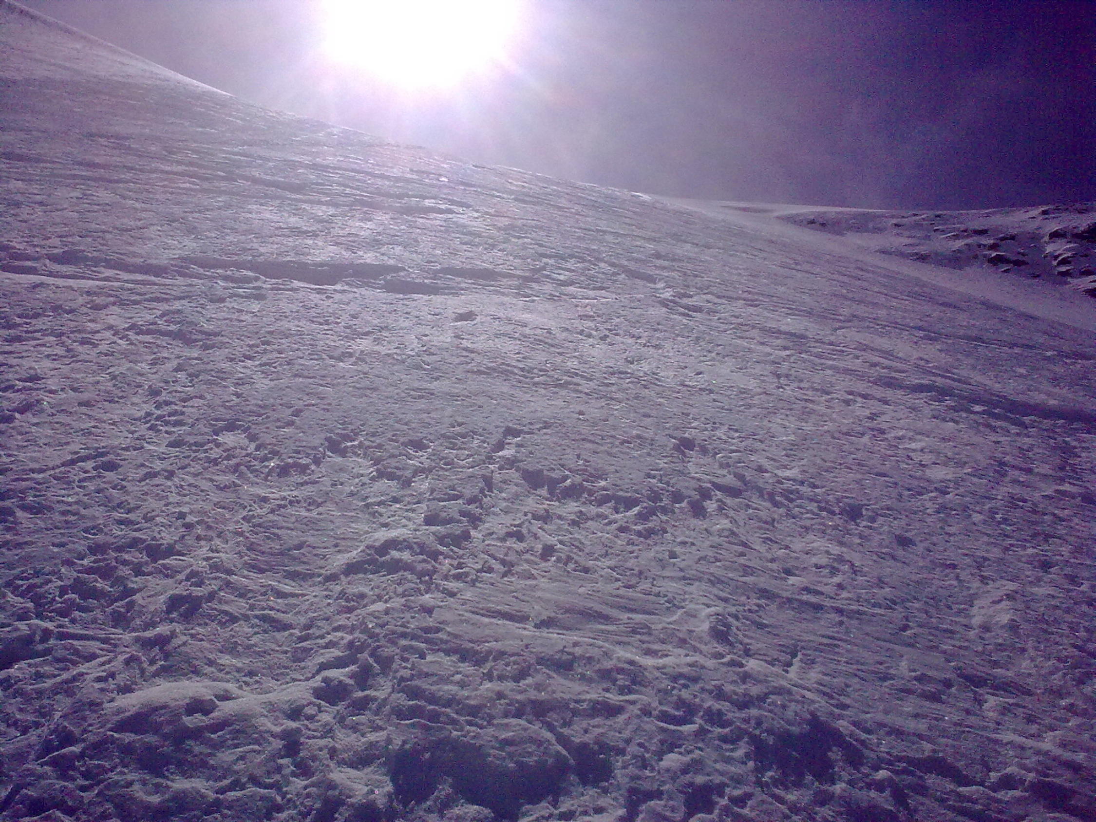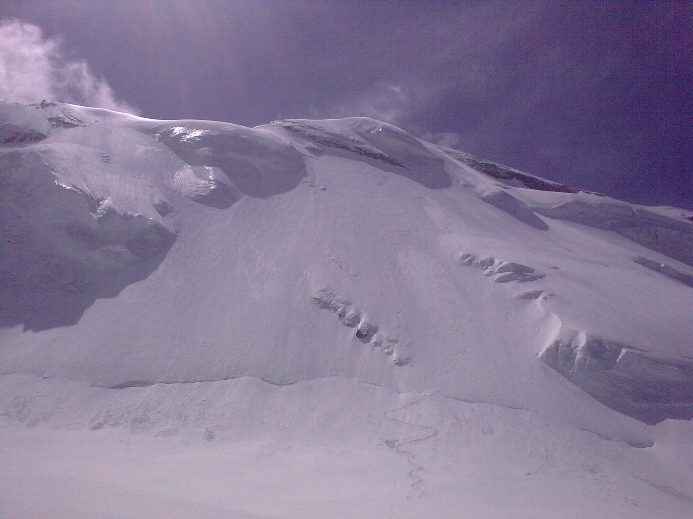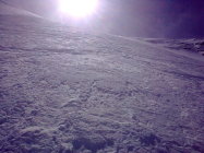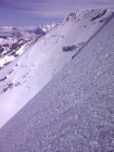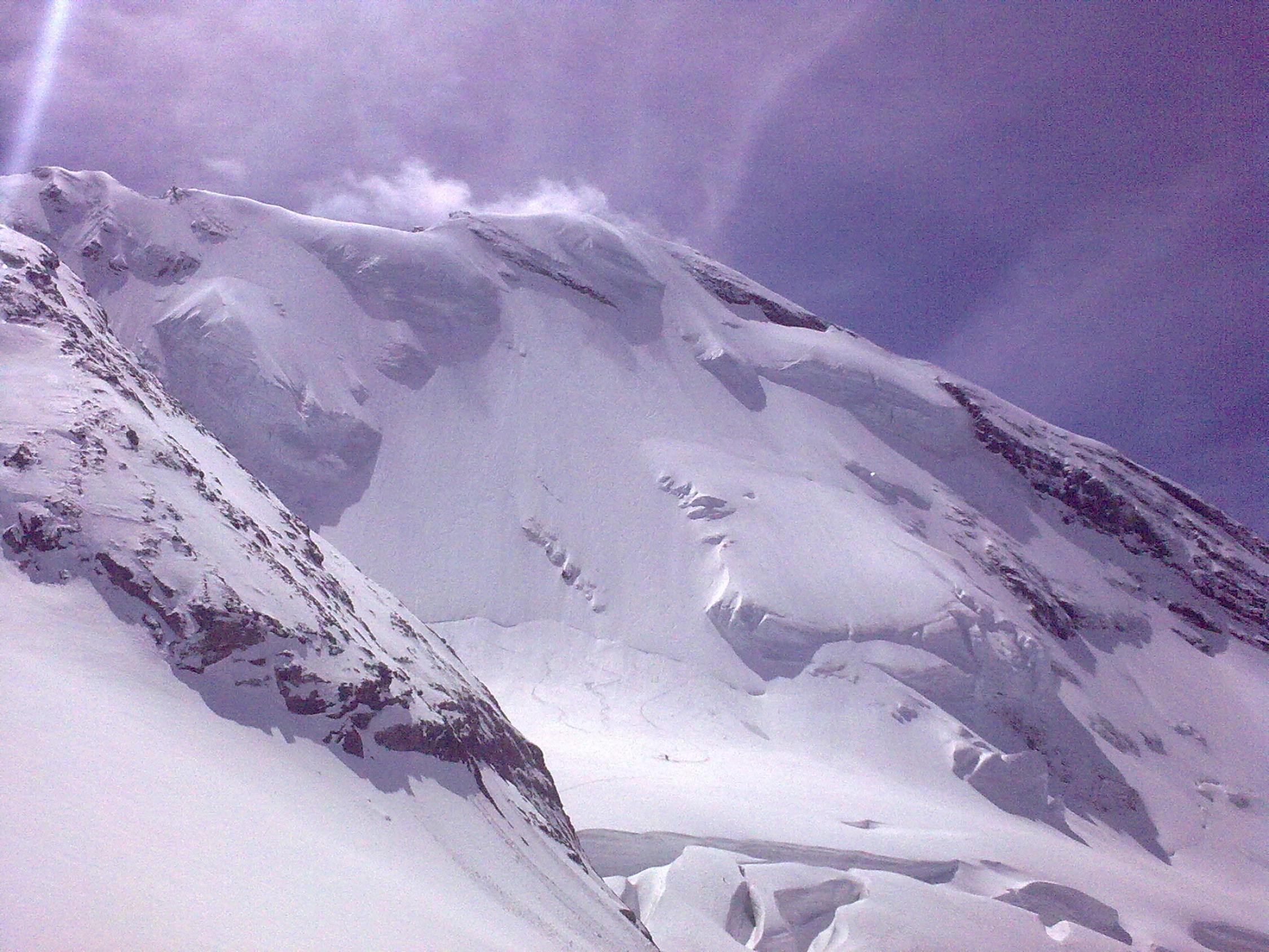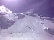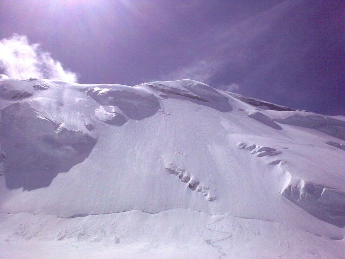 Perfekte Verhältnisse in der Wand: Sehr guter Pulver in der Wand, kein Windeinfluss. Im Bereich der aufsteigenden Querung unter den Seracs hatte man im Aufstieg Eiskontakt (ca. 15-20cm Pulver auf Eis).