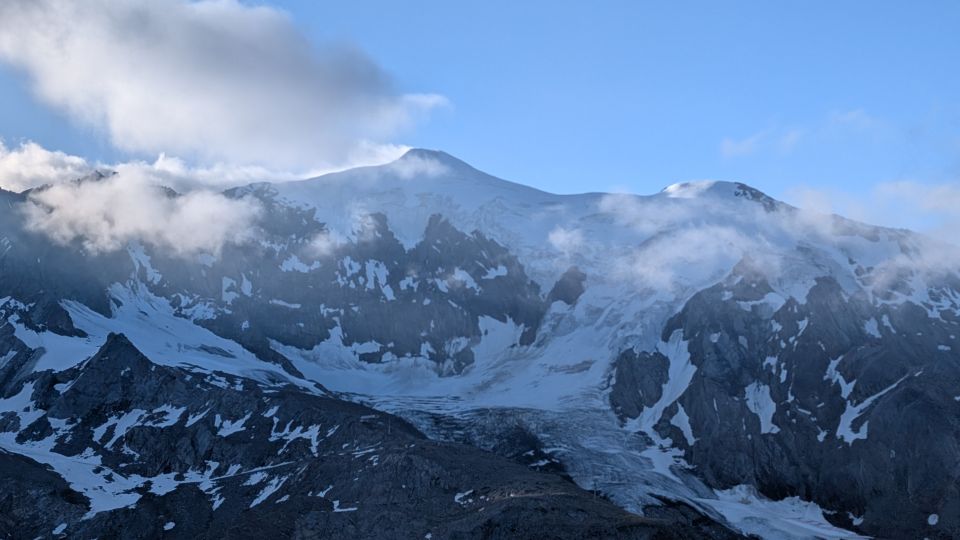 Start um 04:45 Uhr von der Allmageller Hütte, Sonnenaufgang am Zwischenbergpass. Südgrat komplett schneefrei. Sehr schöne Kletterei immer auf dem Grat, kein loses Gestein. Zwar keine Markierung oder Steinmänner, aber Weg gut zu finden.