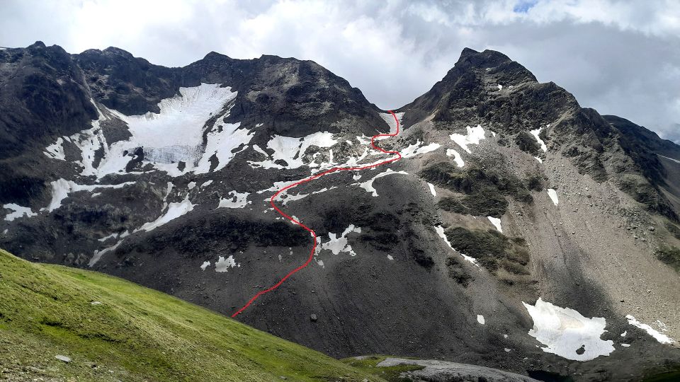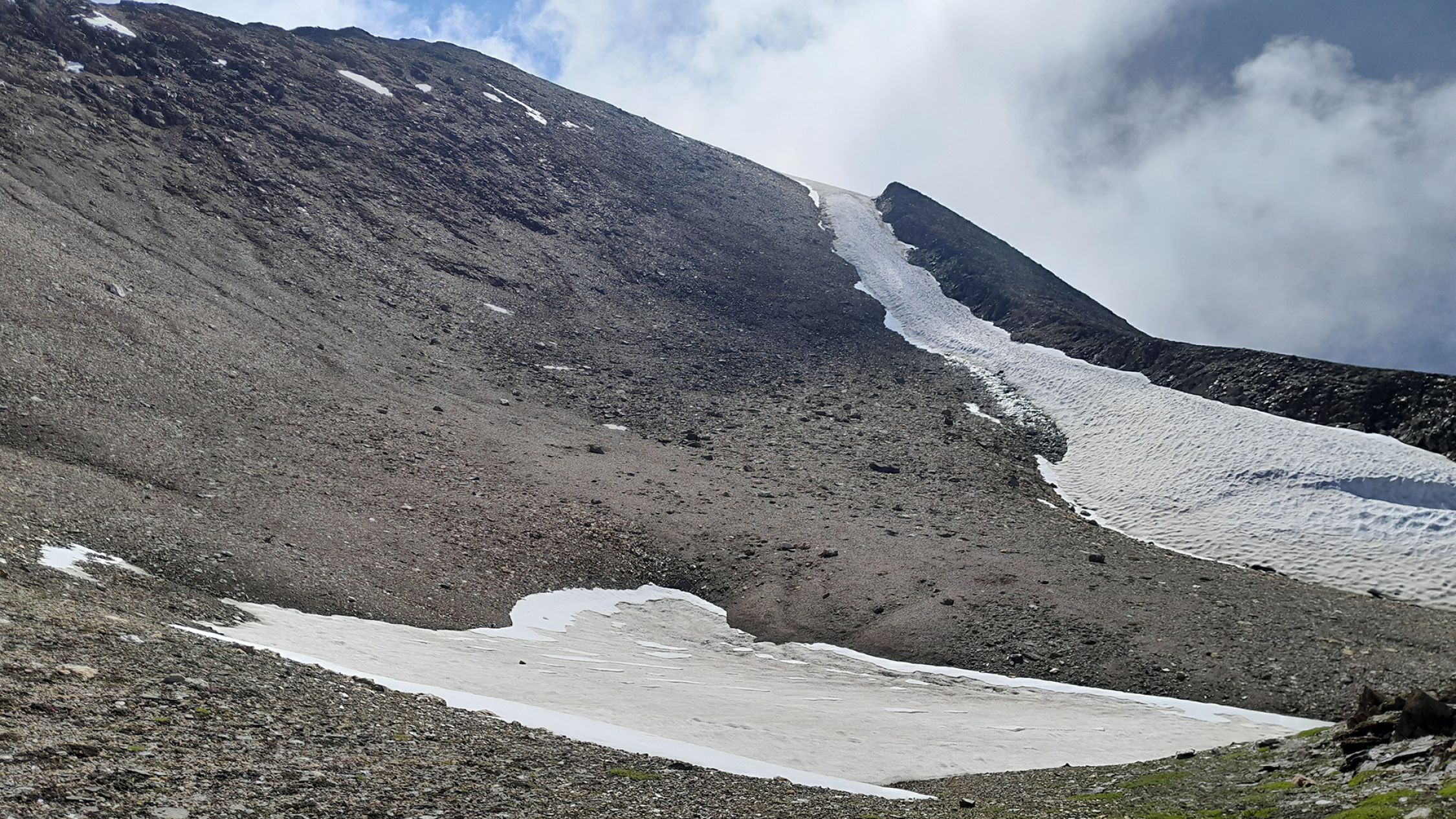 Ab 2700 m erleichten noch Schneefelder der Abstieg. Die Gletscherresten (gibt es sie noch?) mit Altschnee bedeckt, am Morgen noch gefroren (bleiben lange im Schatten) aber problemloss ohne Steigeisen zu begehen, Staub und Feinkies leisten Griffigkeit. Im Tälchen unter dem Gipfel lag noch Schnee, wahrscheinlich noch hart, deshalb habe den letzten Stück über Westgrat gewählt.