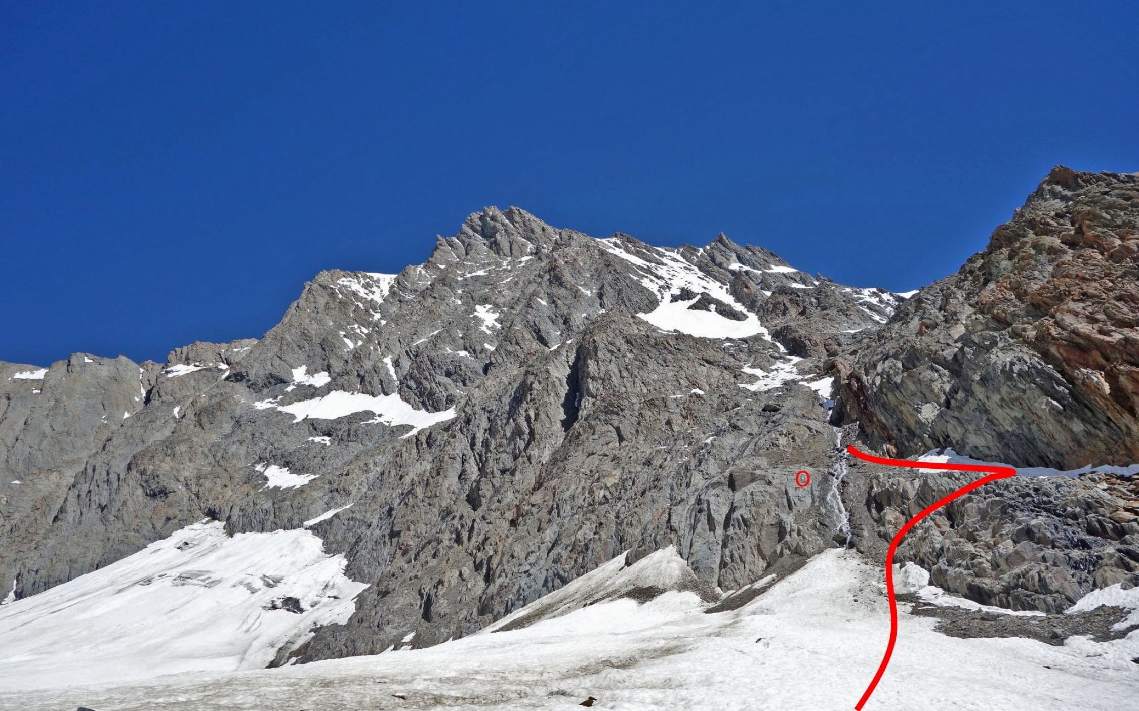 Beim Einstieg ins Couloir rechts vom Bach halten, s. Skizze (kein aktuelles Foto!) . Das aktuelle Verhältnisfoto von unterhalb des Couloirs ist eingefügt.