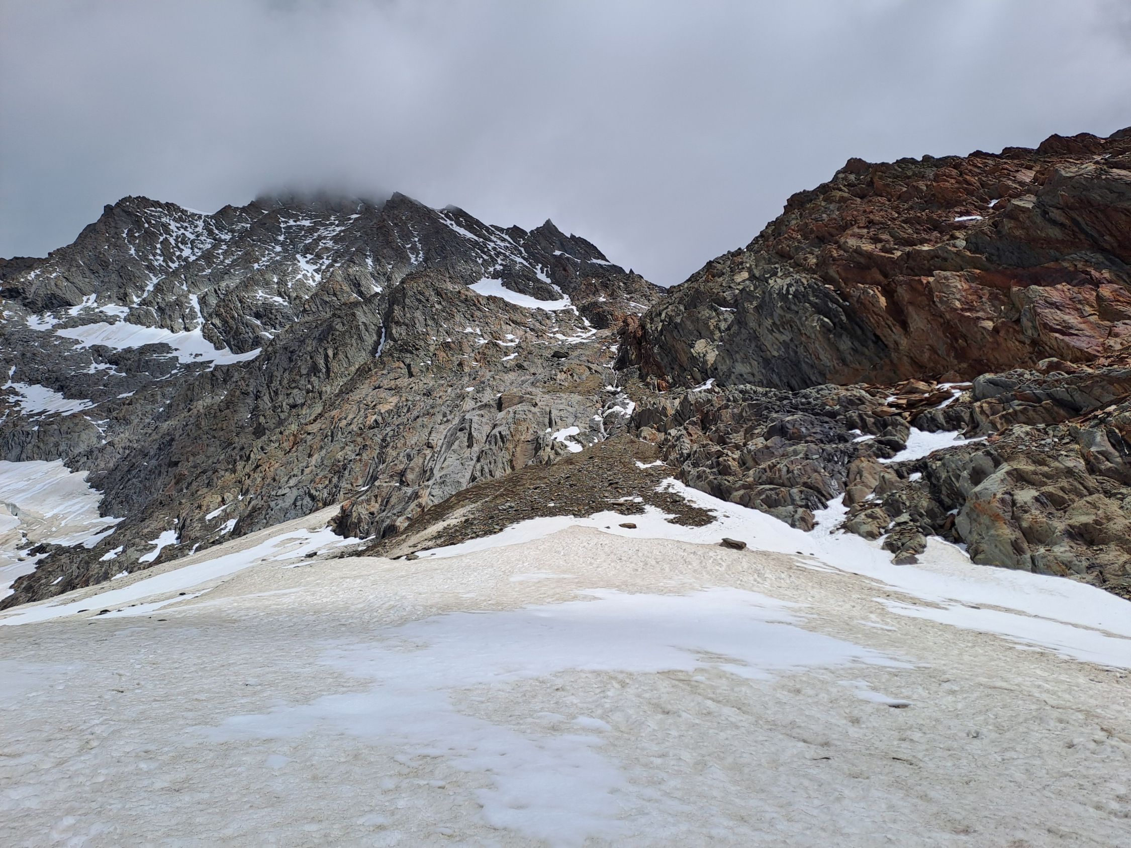 Das Couloir ist noch durchgehend begehbar, auch die Umgehung des ersten Gratteils ist gut machbar. Der Gipfelgrat war am Samstag komplett trocken.