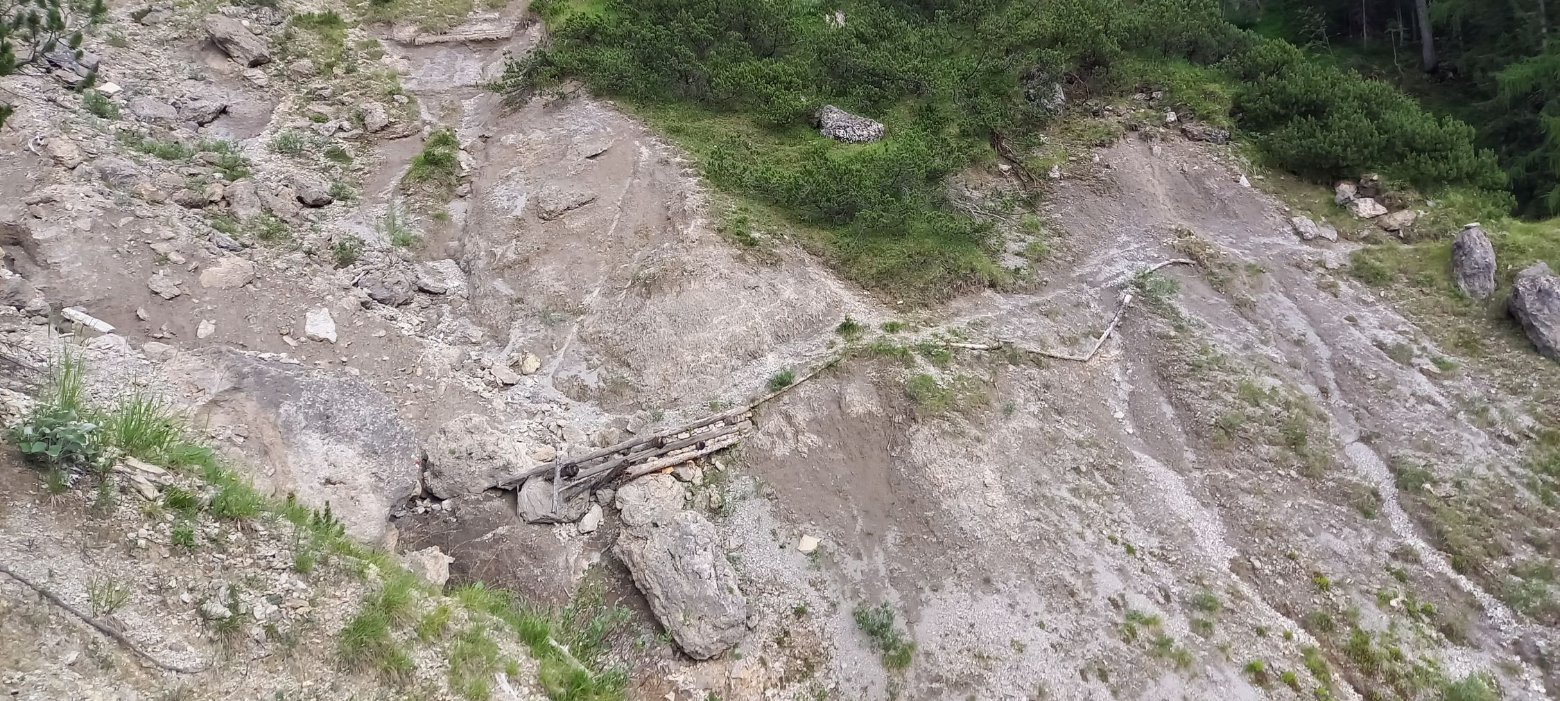 Es hat zahlreiche Hinweise, dass der Weg durch den Fluss im Rio Bosclaf nicht mehr begangen werden soll. Es gibt aber keine valable Alternative für diese Route. Mit einem Pickel könnten Tritte in den Sand an der Stelle des weggespühlten Wegs geschlagen werden.