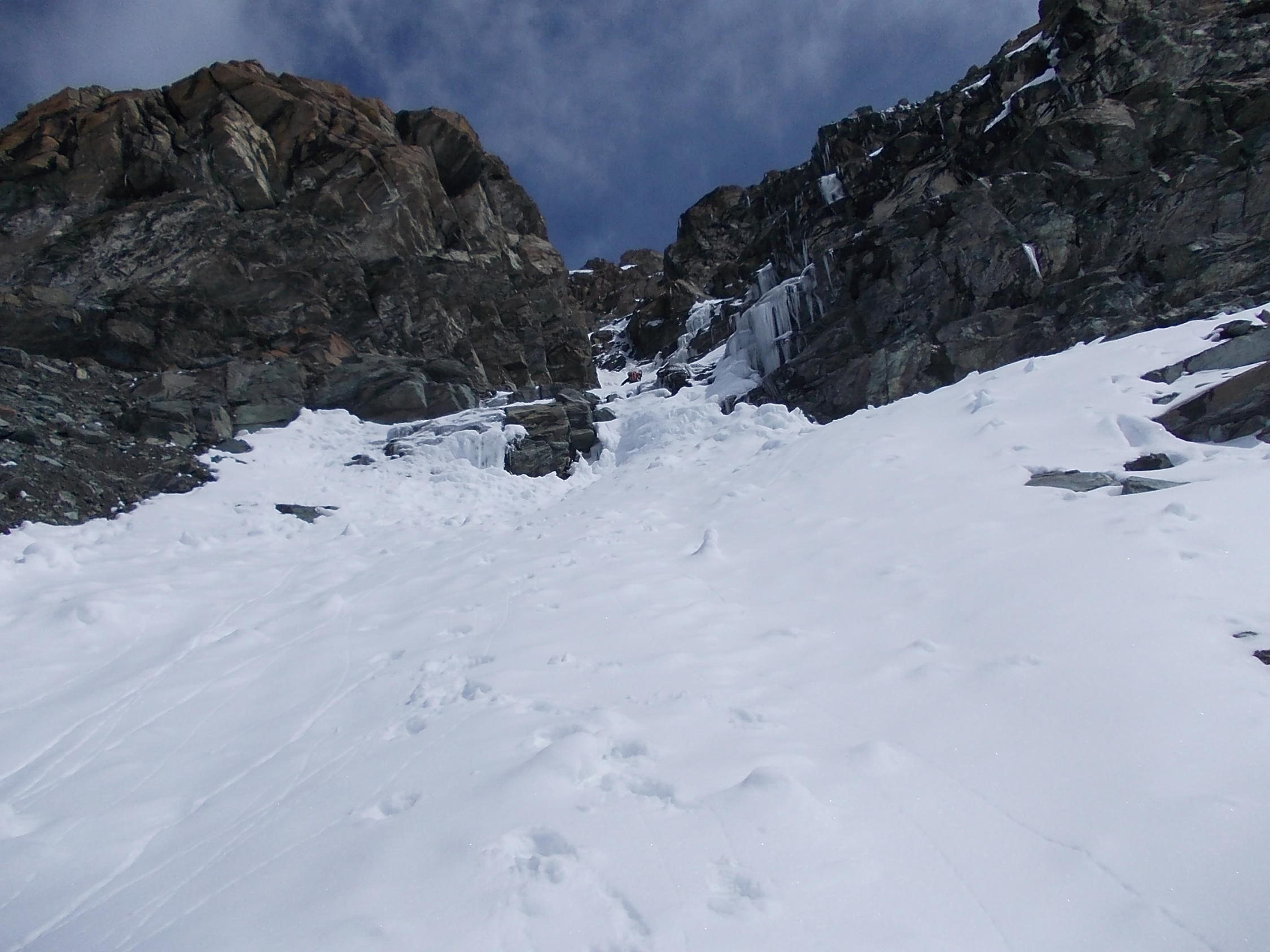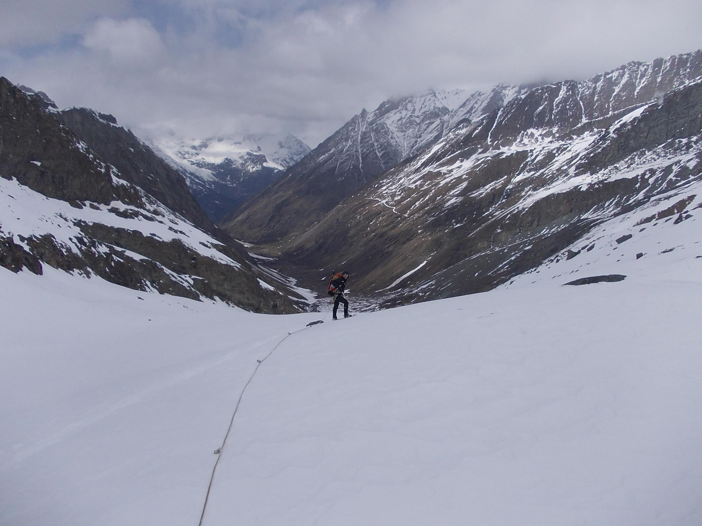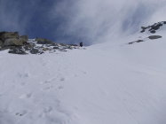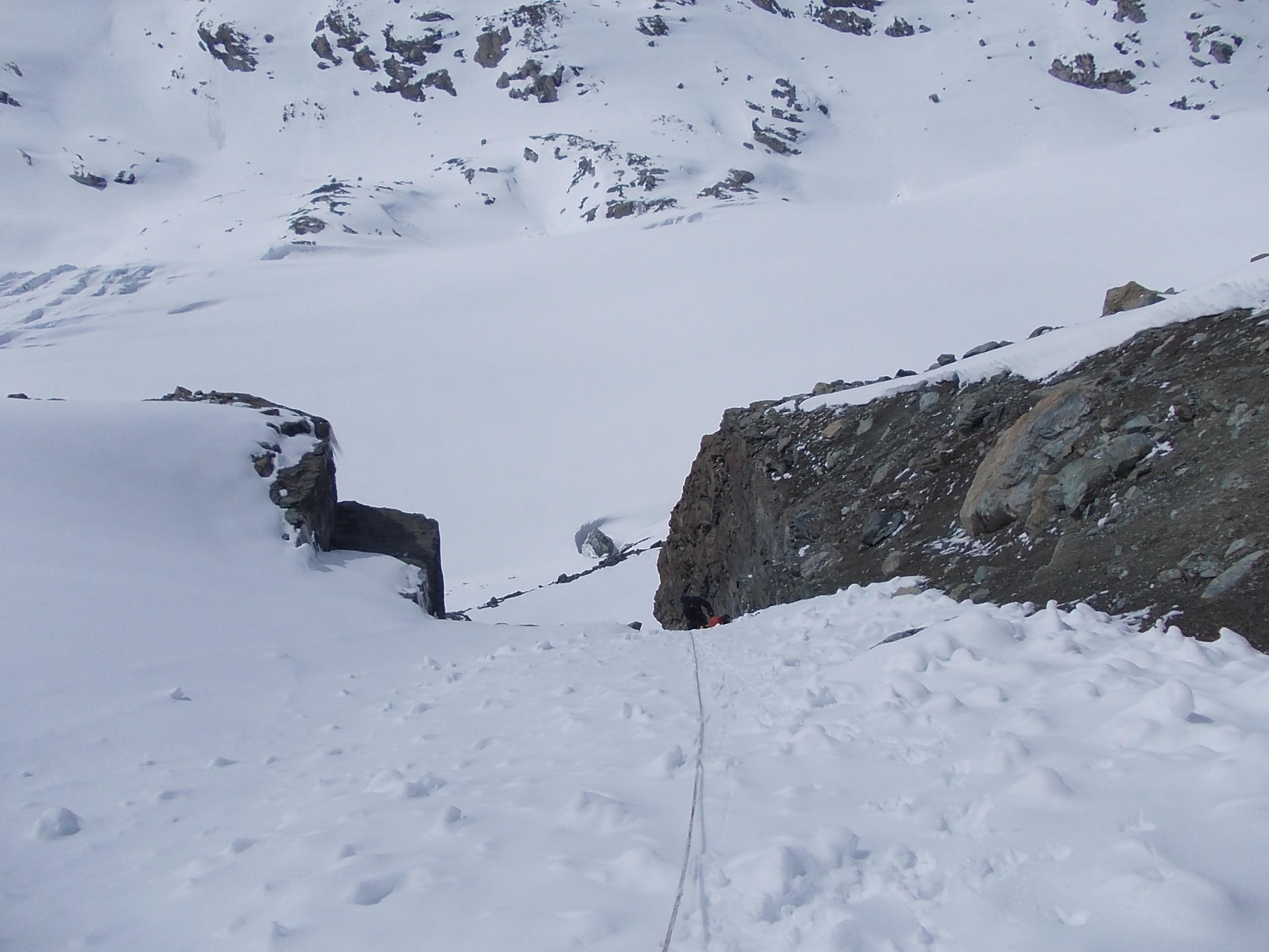 Am Sonntag suchten wir im Bereich der Inneren Rimpfischwang nach einem rascheren Zustieg zum Pfulwesattel. Wir stiegen dabei durch drei verschiedene Firncouloirs mit bis zu 50 Grad Steilheit, inclusive eines Zwischenabstiegs. Die Firnbedingungen in diesen Couloirs waren ideal. Allerdings war die Begehung aufgrund unserer schweren Rucksäcke nicht ganz einfach.