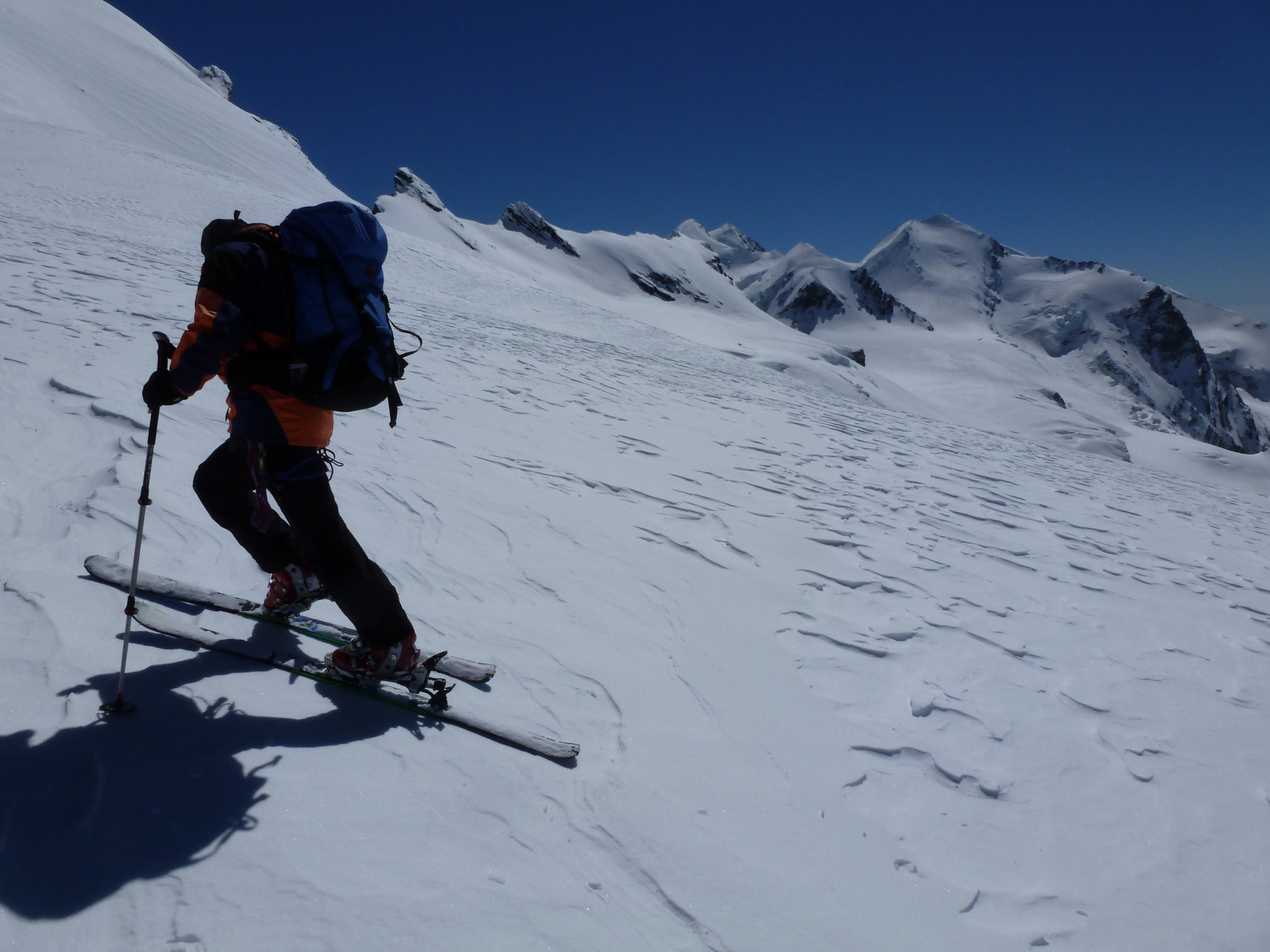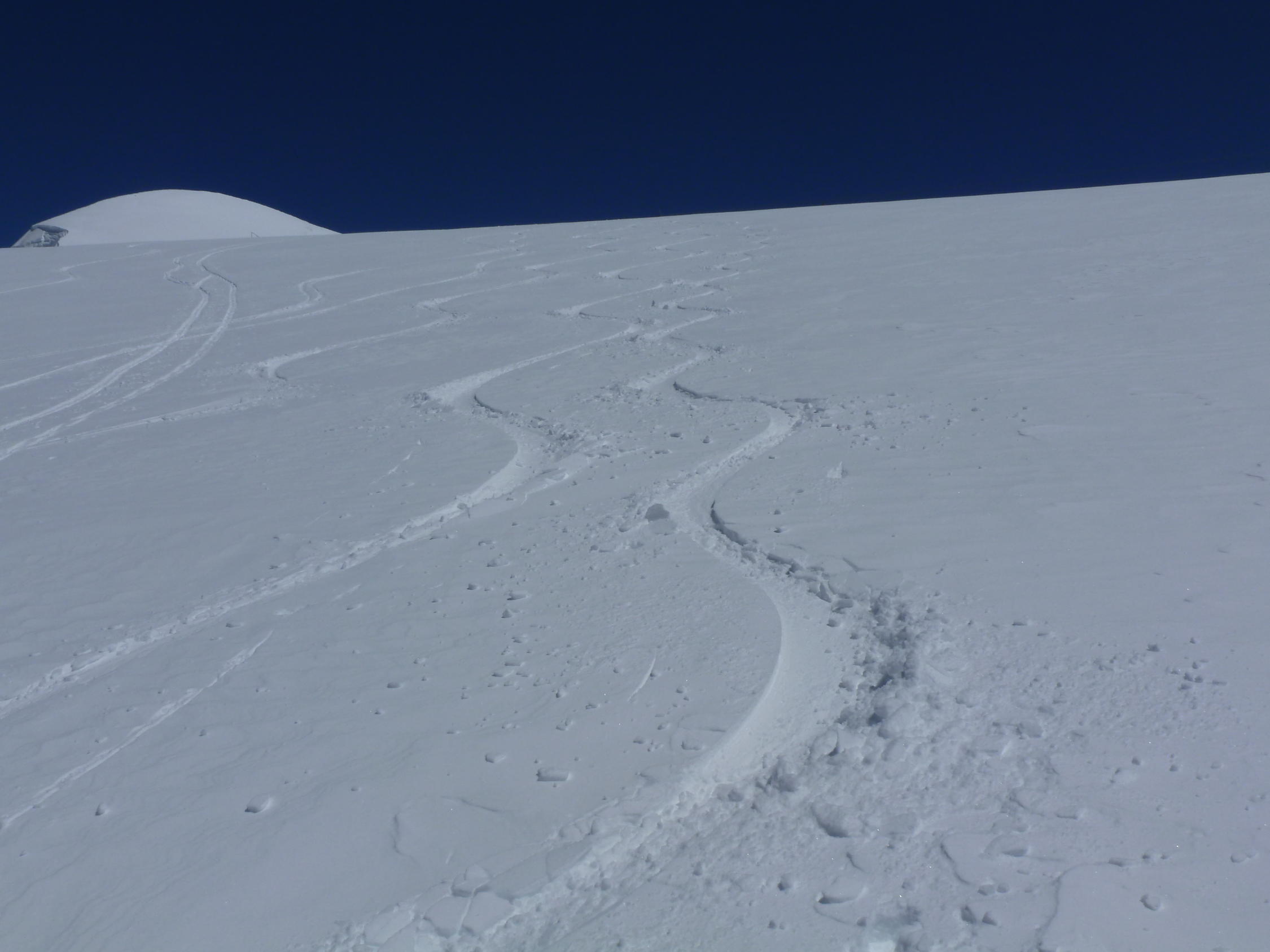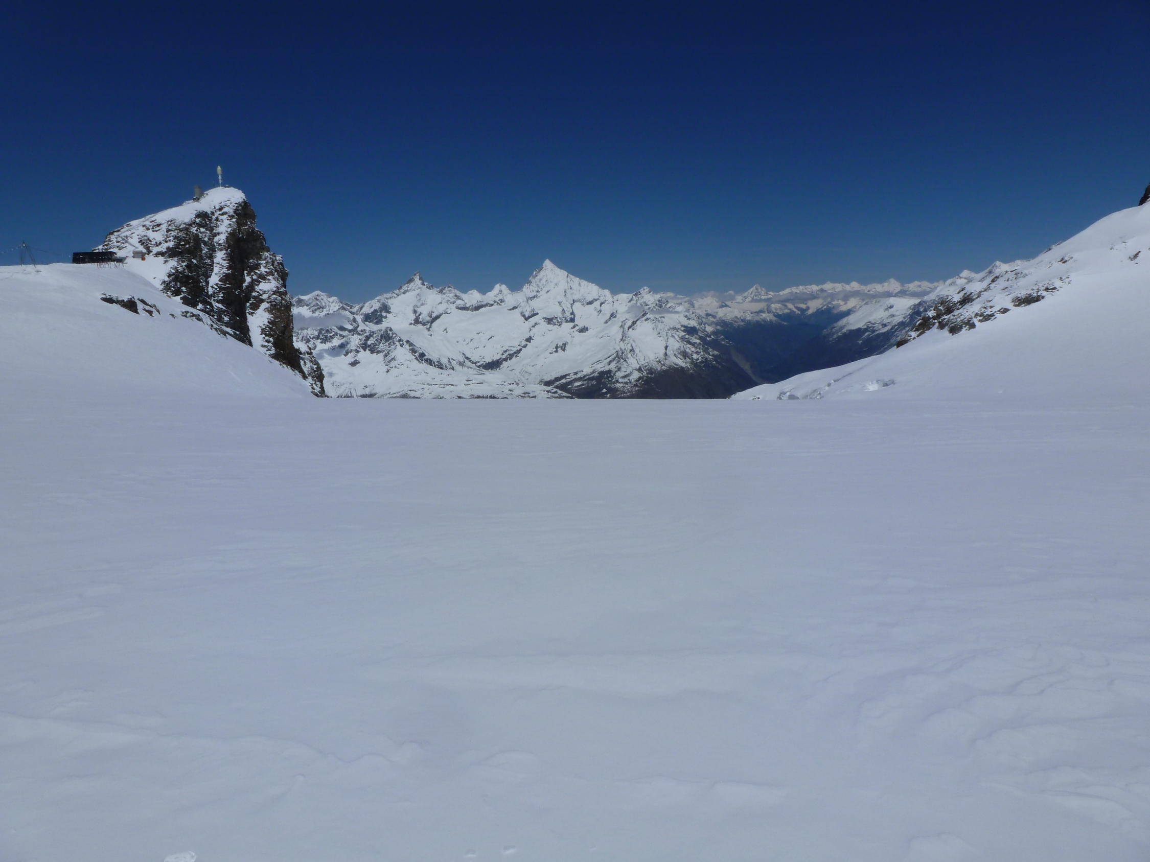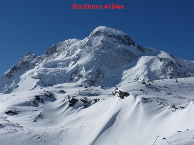 Schnee: In der SSW-Flanke wechselnde Verhältnisse(leichter Windharsch, Hart, Pulver). In der weiteren Abfahrt vom Breithornplateau 3795m nach Trockener Steg 2939m, mehrheitlich schönster Pulver.