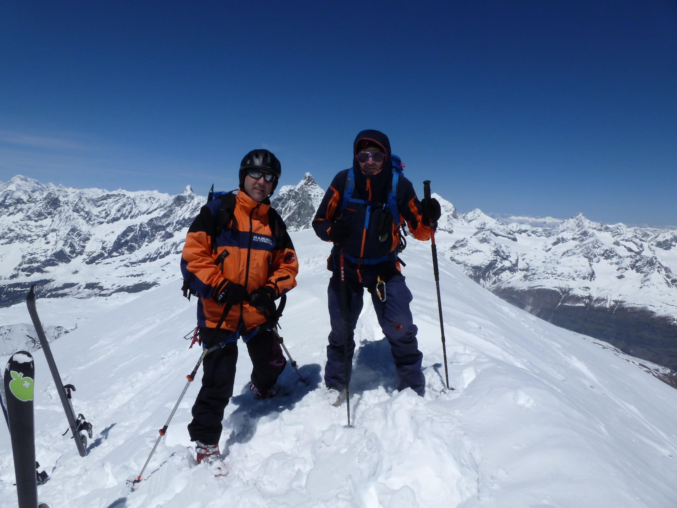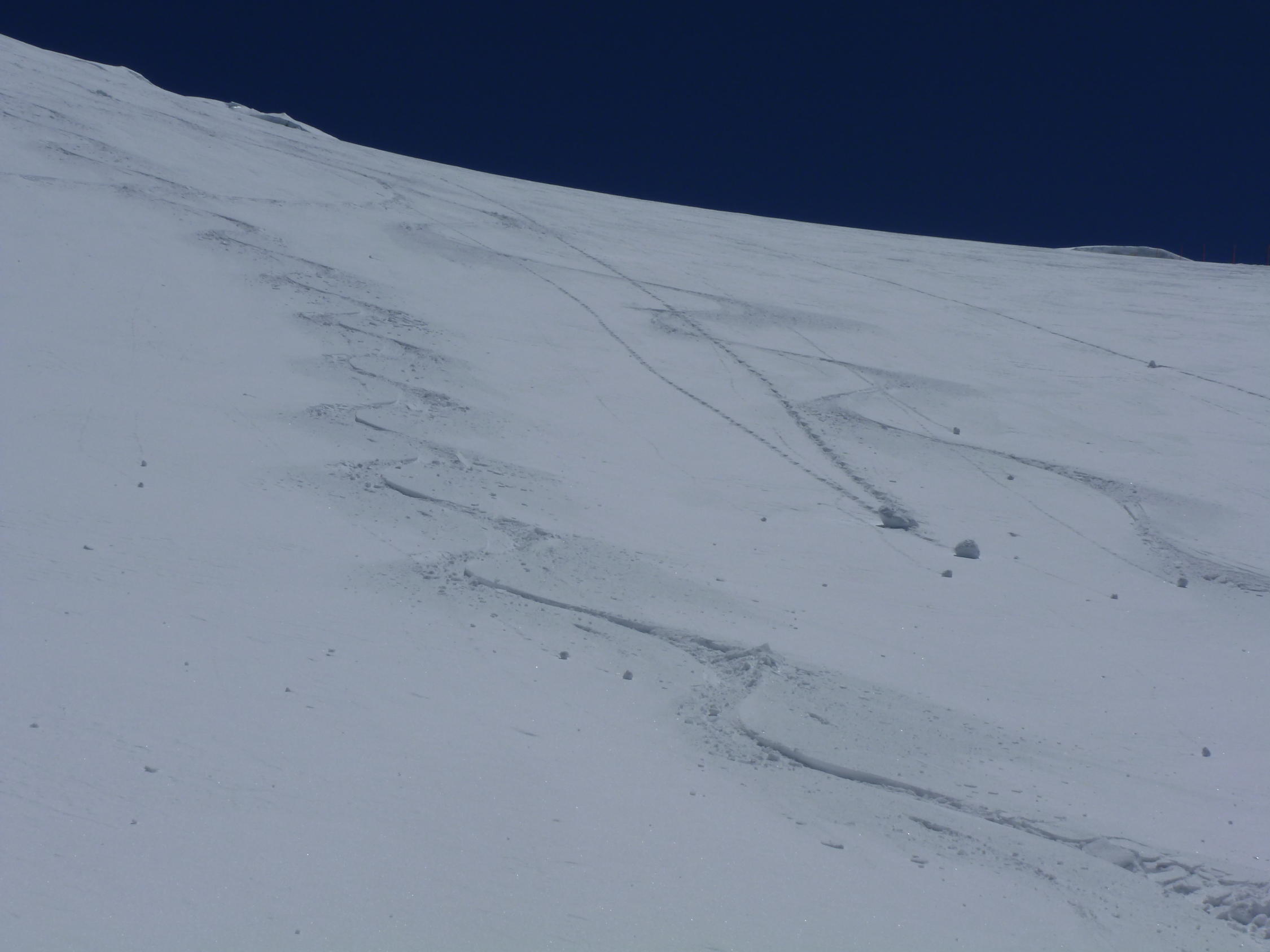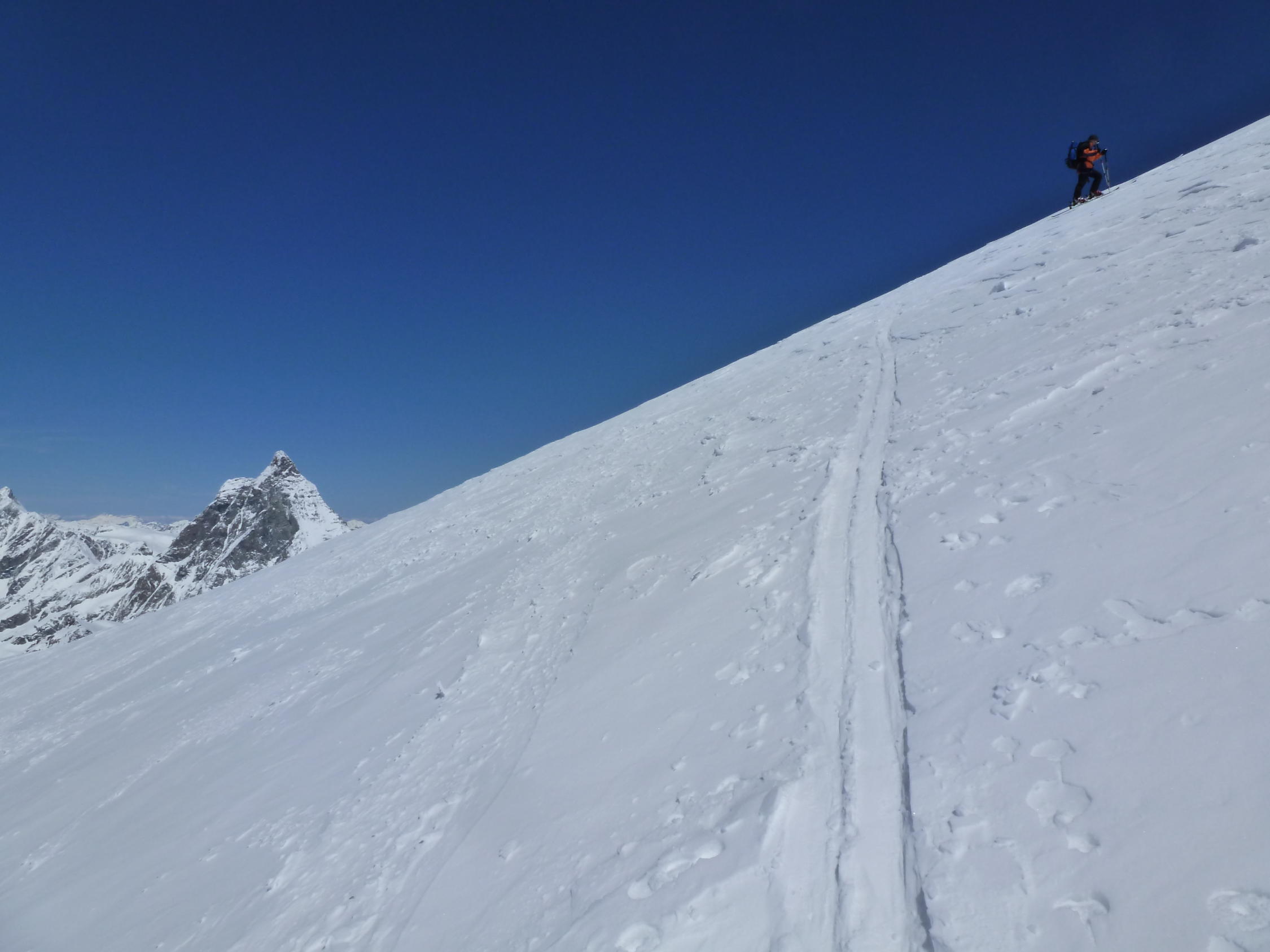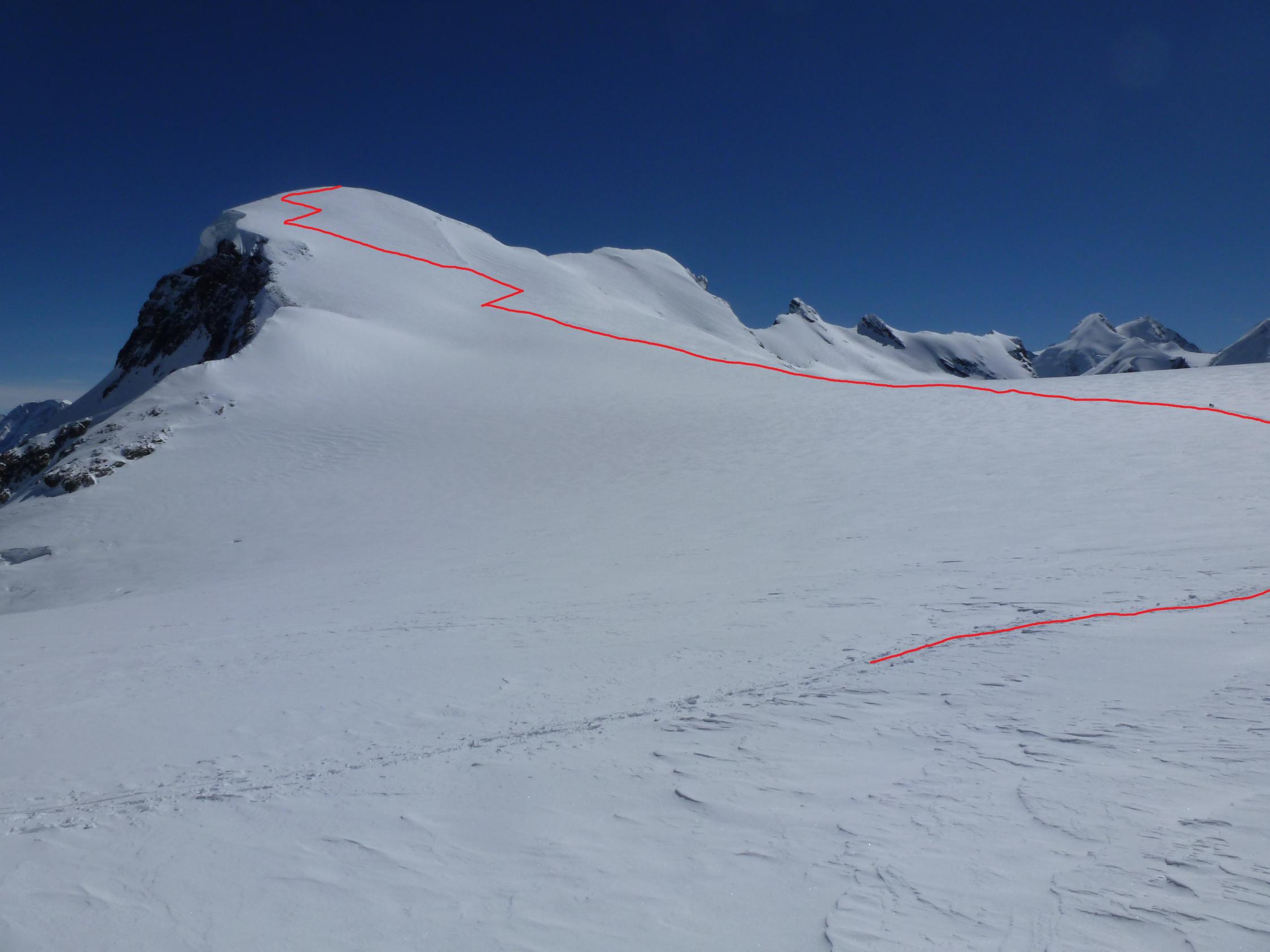 Schnee: In der SSW-Flanke wechselnde Verhältnisse(leichter Windharsch, Hart, Pulver). In der weiteren Abfahrt vom Breithornplateau 3795m nach Trockener Steg 2939m, mehrheitlich schönster Pulver.