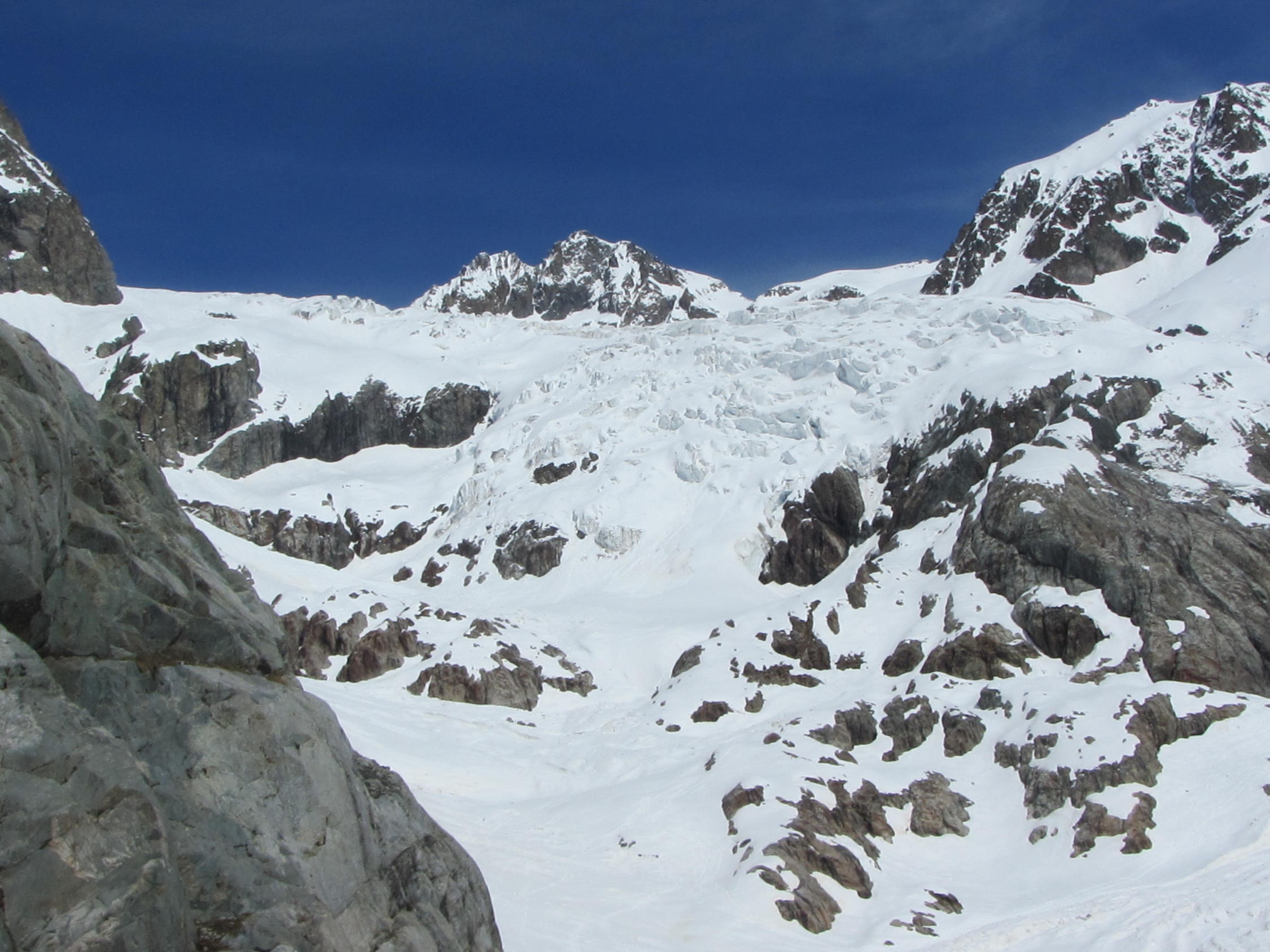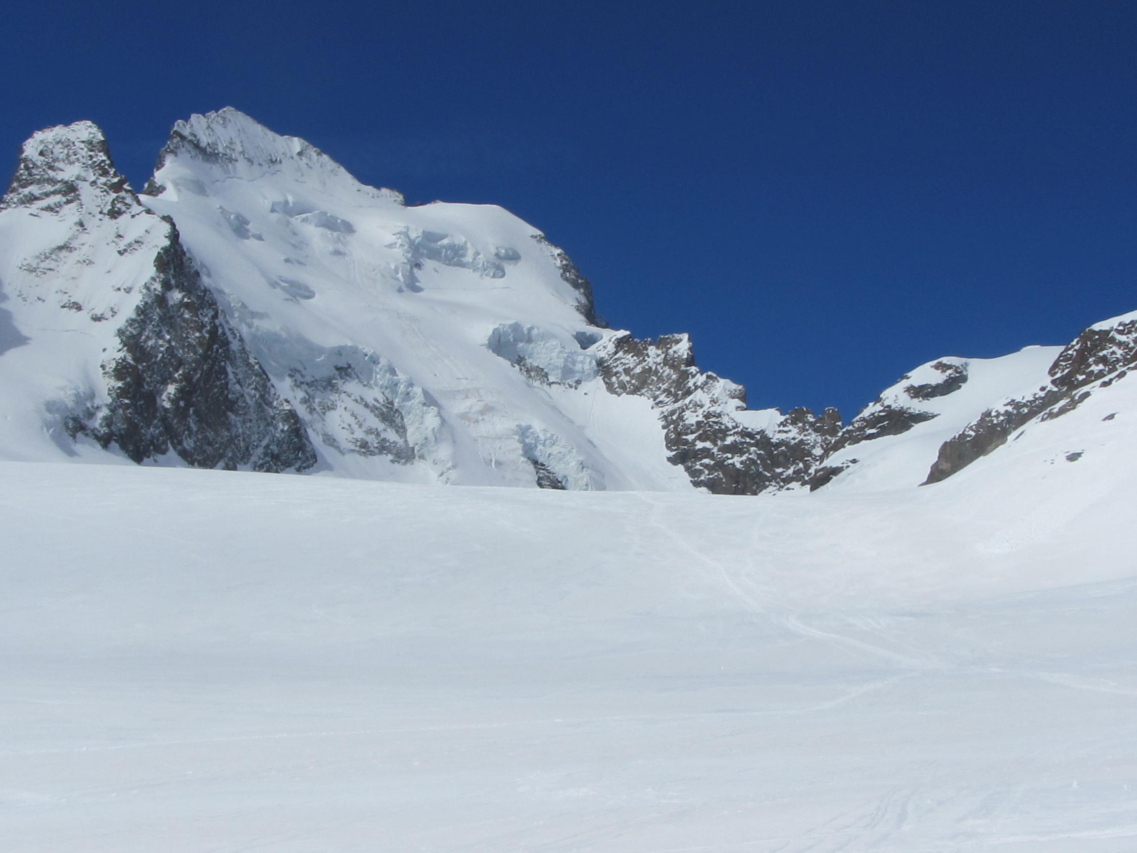 Couloir: Bergschrund noch ok, Brücke wird dünner, guter Trittschnee, Eis ist teilweise nicht mehr weit. Es sind am Vortag einige vom Gipfel abgefahren, sieht nicht mehr gross lohnend aus, schauen schon einige Steine raus. Wir sind rückwärts wieder abgestiegen.