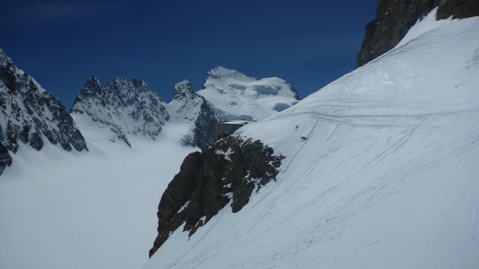 Gletscher noch sehr gut eingeschneit. Aufstieg Nordflanke Glacier Blanc mit guter Spur, zum Teil verfahren und dadurch Harscheisen unumgänglich.