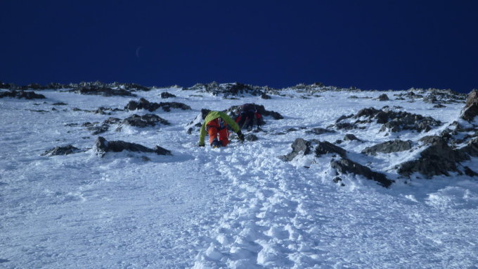 Couloir Coolidge mit imposantem Bergschrund der noch gerade gut zu Überwinden ist. Wändli dann meist Trittschnee, zwei Passagen mit Fels und für ca. 10 m spürt der Pickel das Eis.