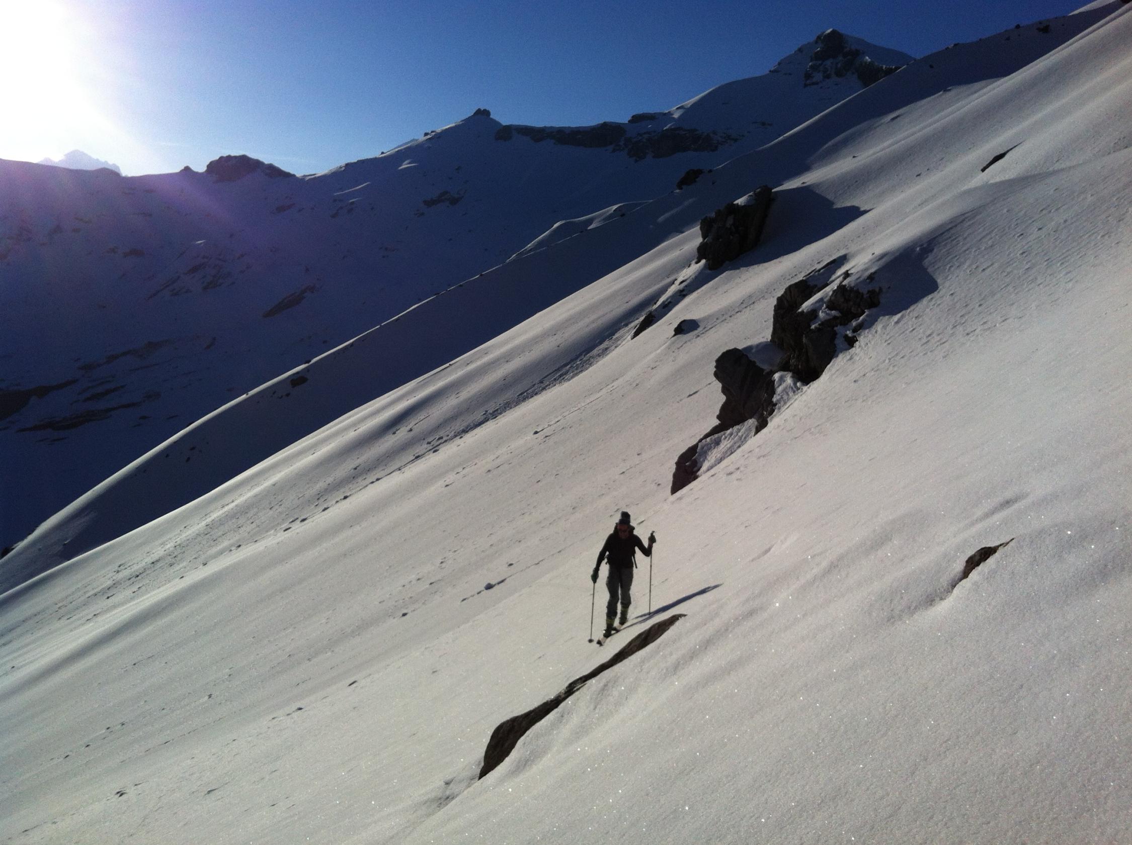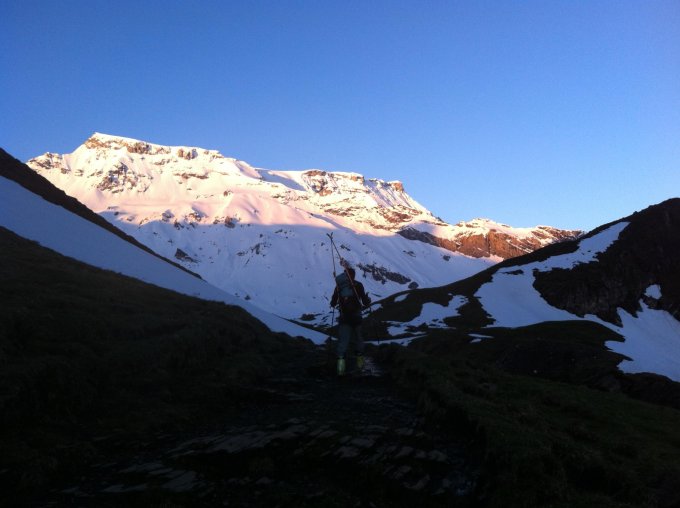 Da die Bahn auf die Engstligenalp zur Zeit nicht in Betrieb ist, müssen die sechshundert Höhenmeter über den noch nicht geöffneten Bergweg, mit den Skiern auf dem Rücken erklommen werden. Auf dem Weg zur Engstligenalp hat es noch einige steile Schneefelder die zu queren sind. Vorsicht bei hartem Schnee! Die Ebene auf der Engstligenalp ist noch ganz Schneebedeckt. Früh starten !
